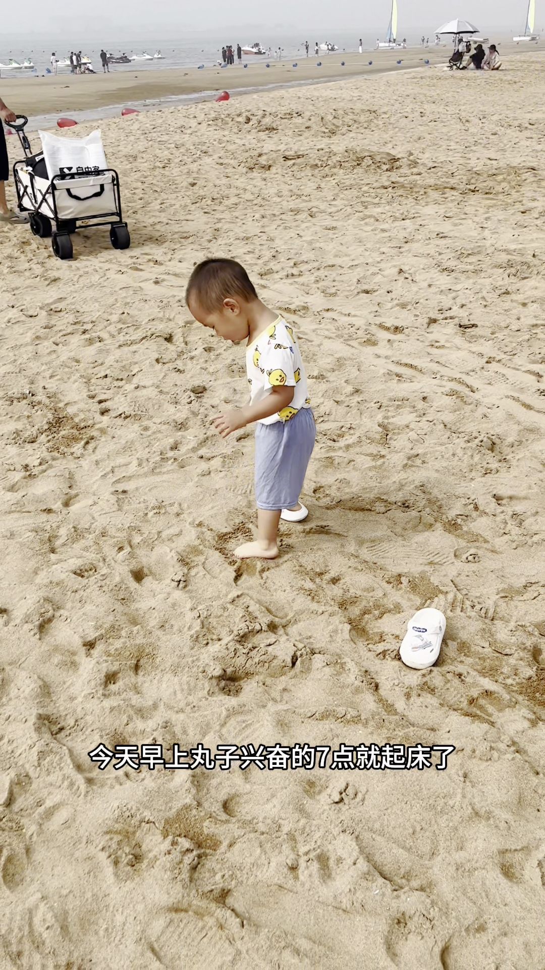 4. 时间转眼来到了第二天早上,起床收拾收拾就出发去海滩。秦皇岛是真凉快,海风吹到身上可舒服了。今天早上丸子兴奋的 7 点就起床了,8 点就到海边了。接下来给你们看看都准备了什么: