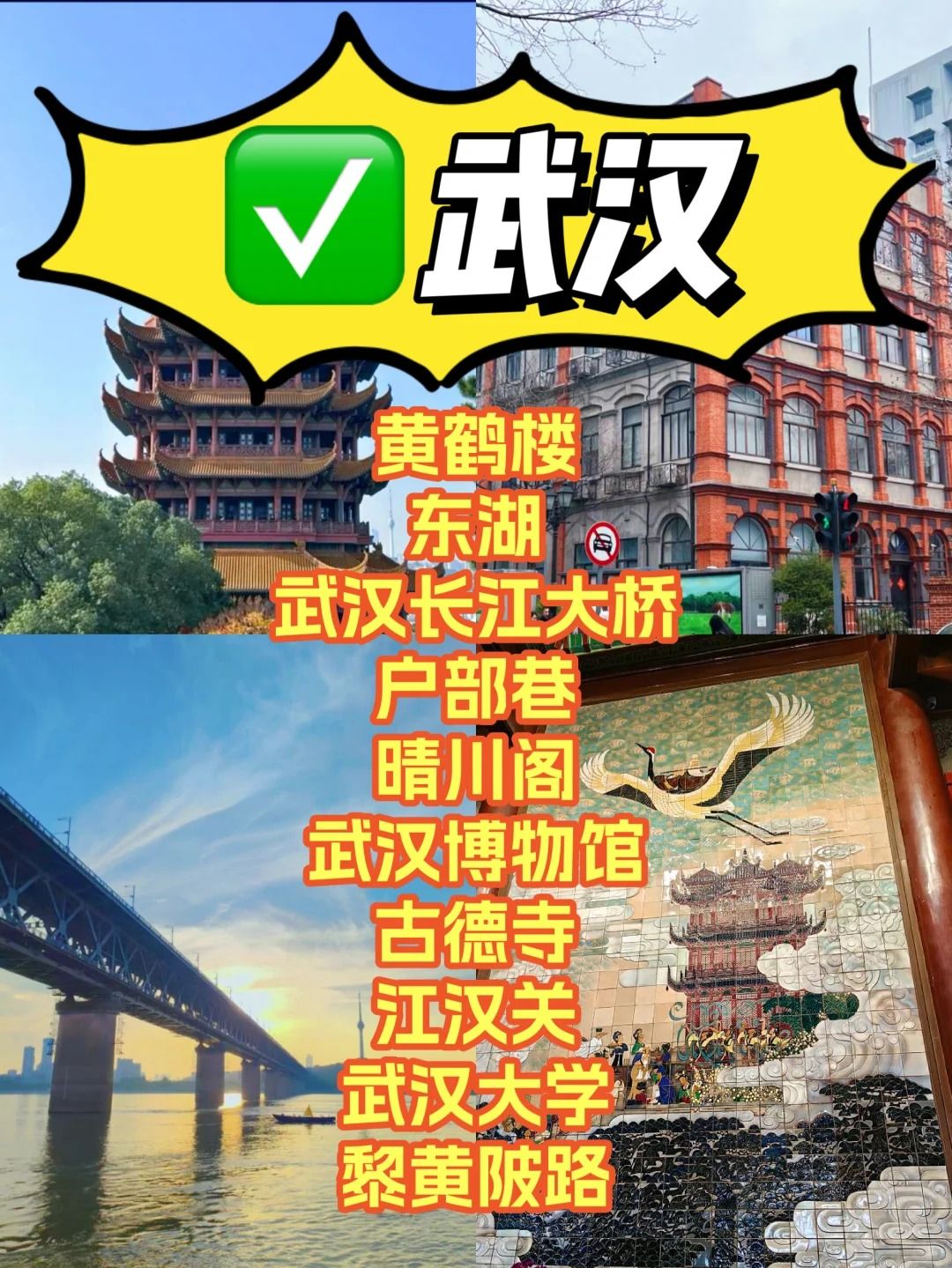 黄鹤楼,东湖,武汉长江大桥,户部巷,晴川阁,武汉博物馆,古德寺,江汉关,武汉大学,黎黄陂路