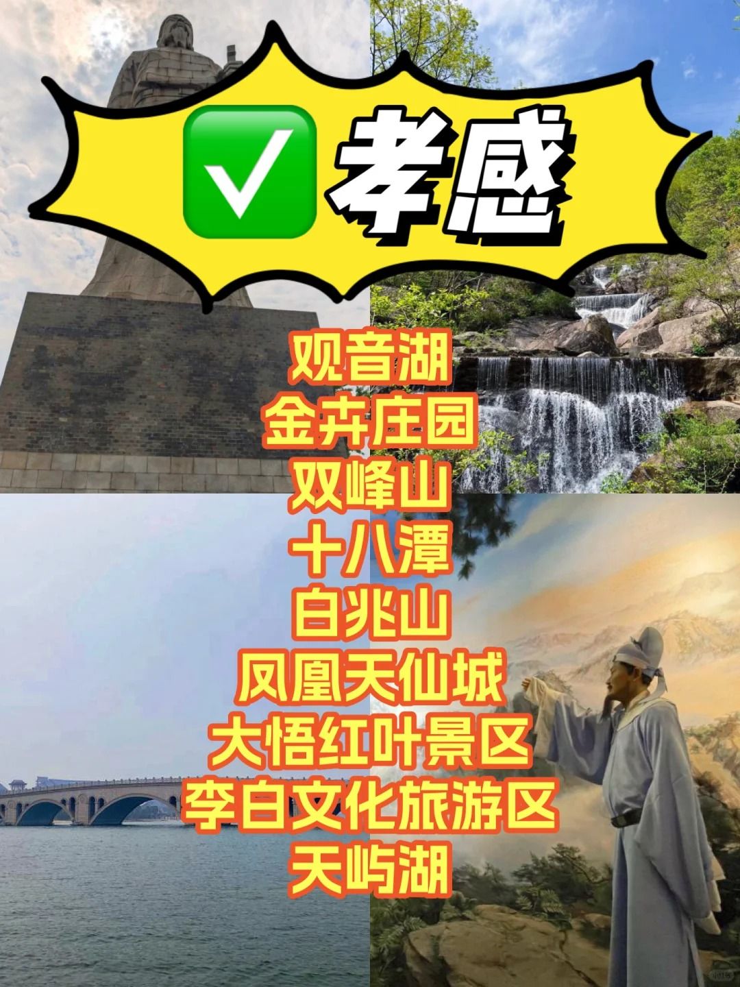 观音湖,金卉庄园,双峰山,十八潭,白兆山,凤凰天仙城,大悟红叶景区,李白文化旅游区,天屿湖