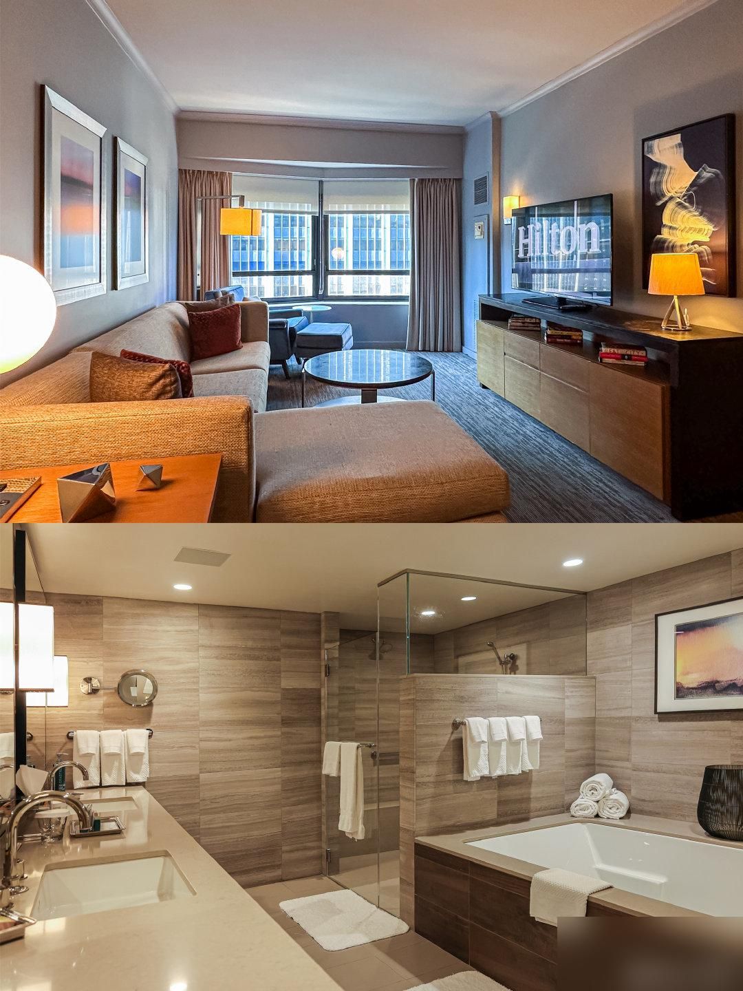️这间希尔顿高达45层,拥有2000多间客房,每一间都宽敞舒适,现代设施齐全;独特的枫木家具和大理石浴室,彰显出酒店的格调与品位。酒店提供的中式欢迎早餐令人倍感惊喜。清晨醒来,能吃到热腾腾的大米粥,搭配中式饺子和炒面等,让人感受到了家的温暖。这种贴心的服务,实在让人难以忘怀。