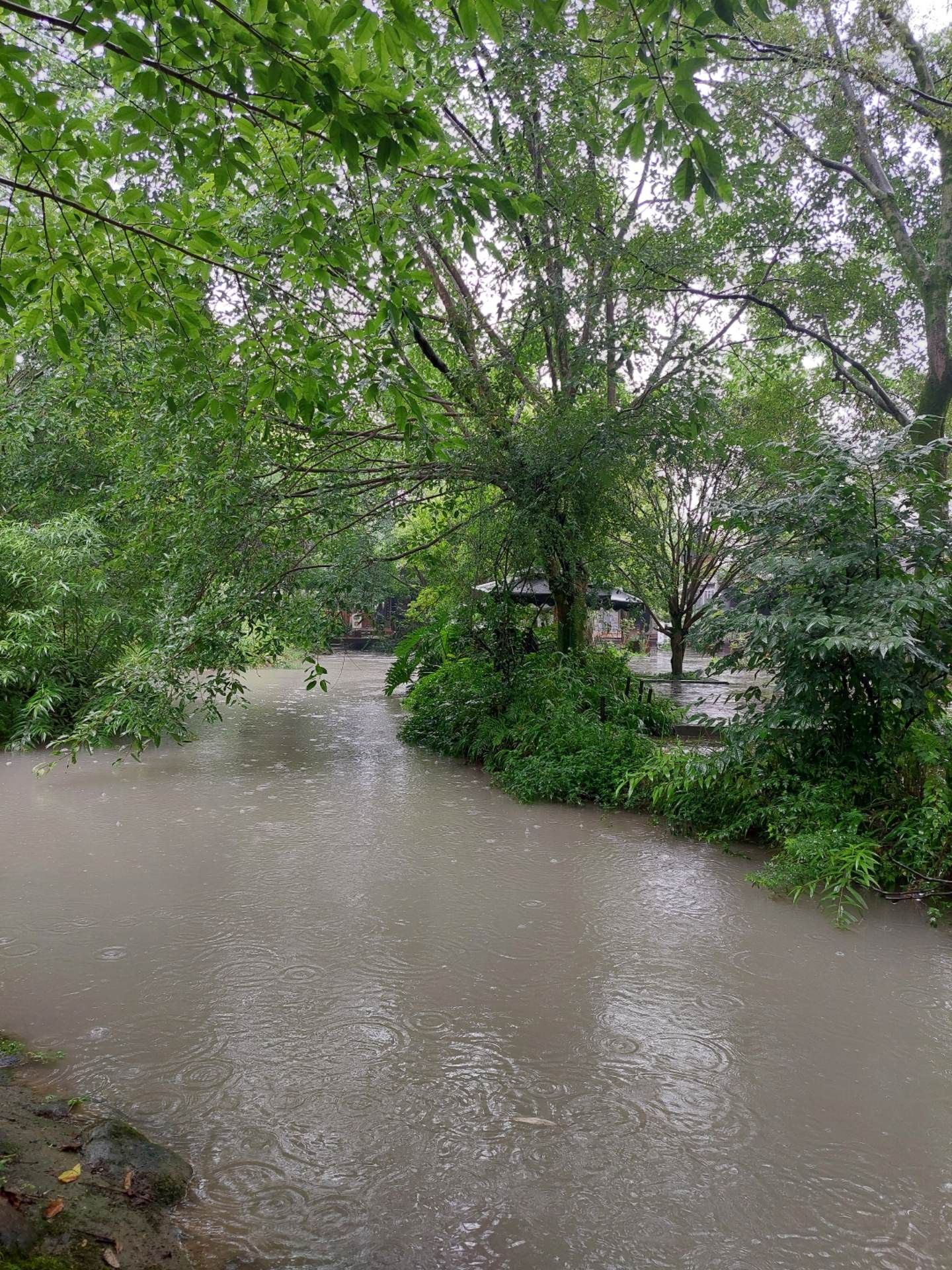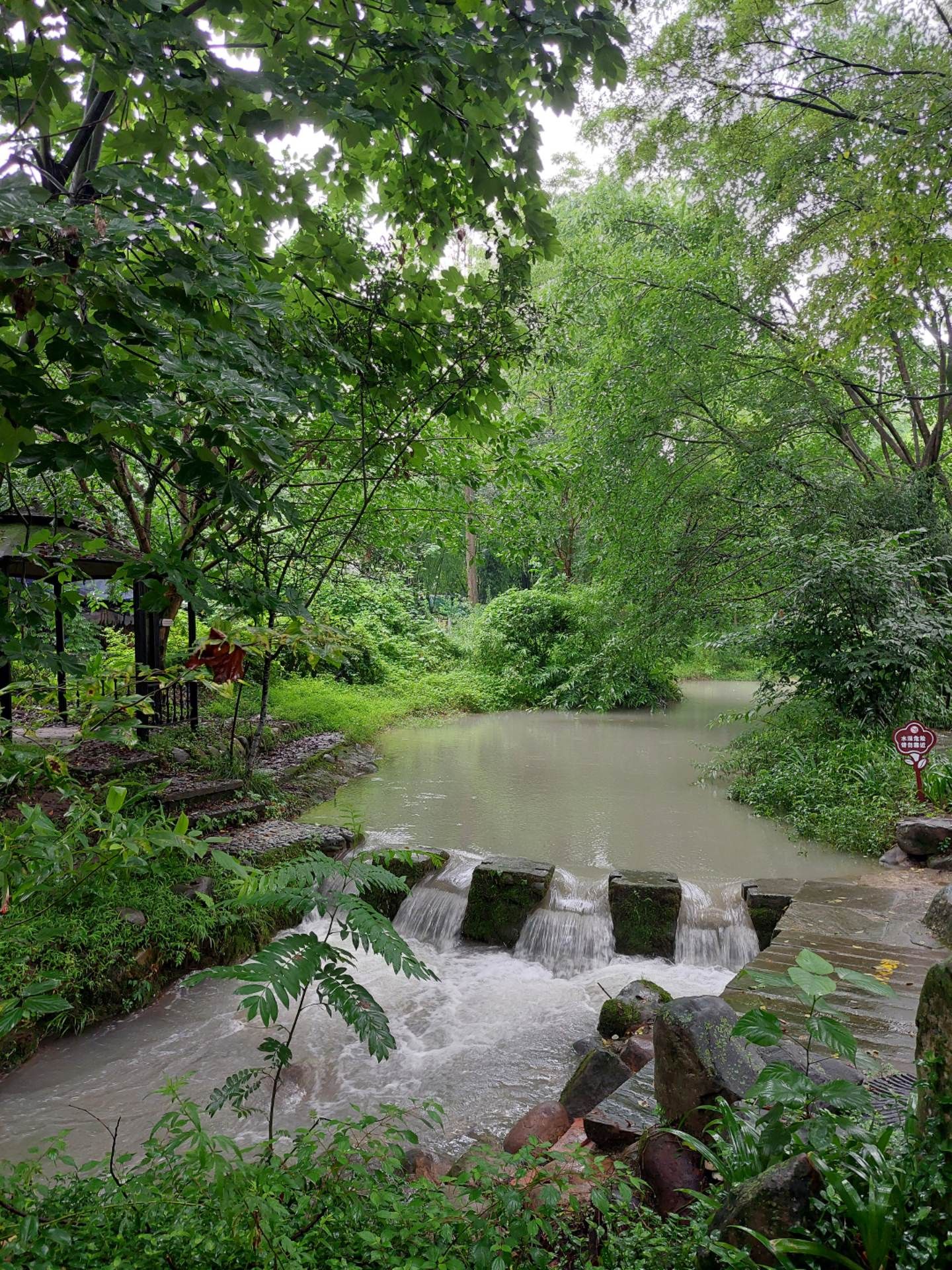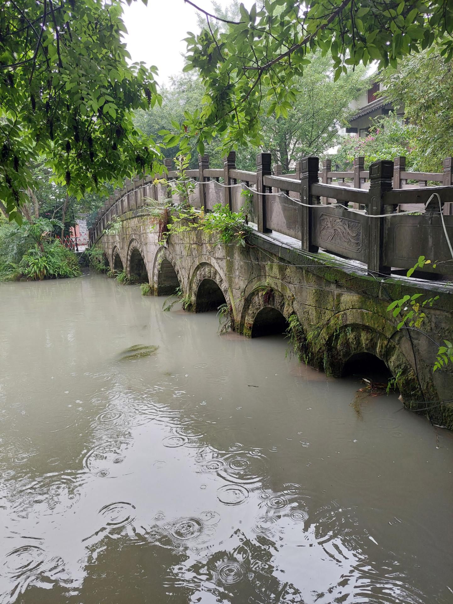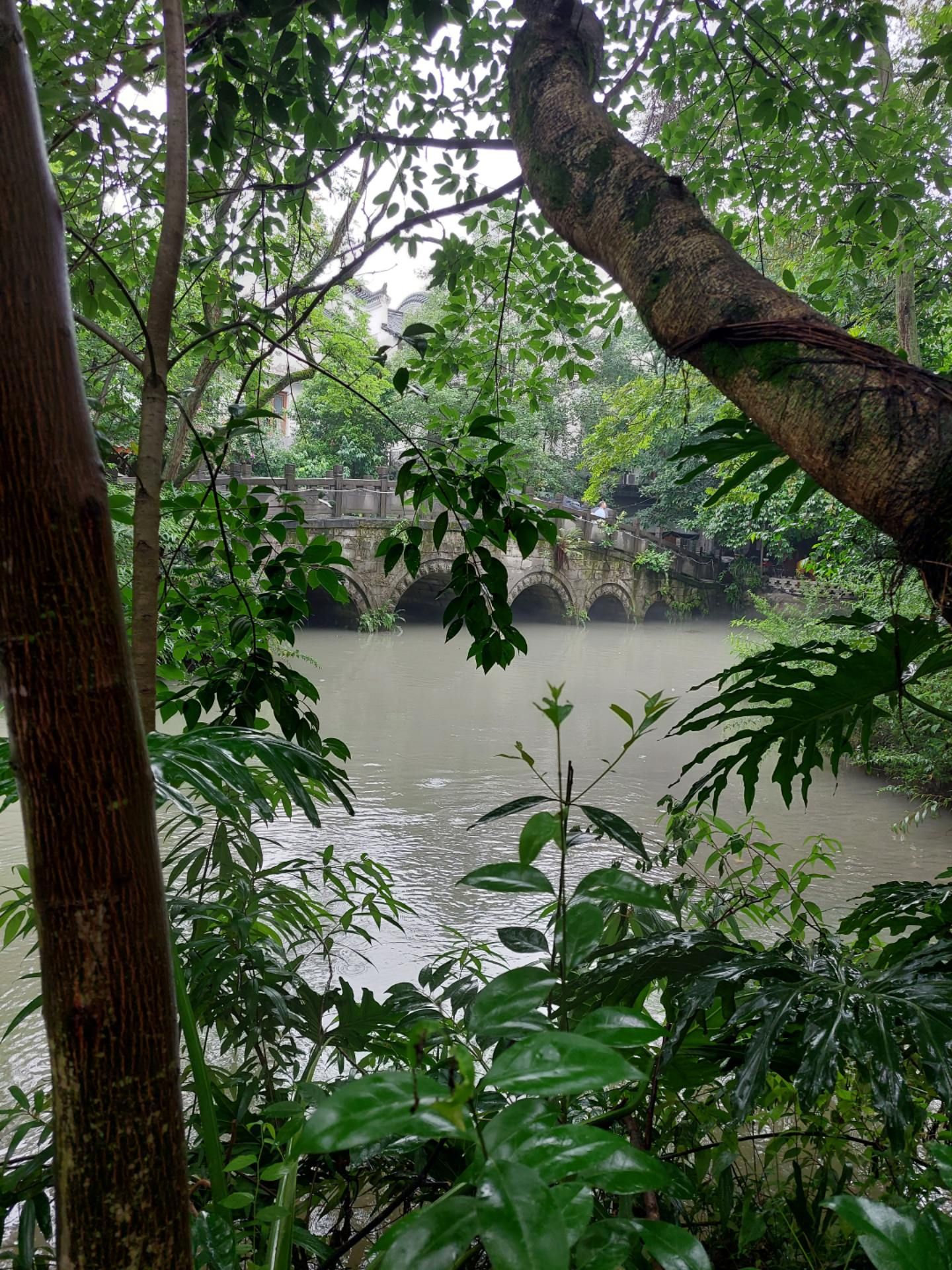 九洞桥上拱形的桥面的青石板在雨后有些湿滑,须小心翼翼的慢慢走,因下雨桥下的河水急速穿过桥下九个大小不一、对称排列的桥孔。顺着二堰河而上,两边尽是休闲茶楼,今天却因下雨而生意冷落,不少茶座干脆收起了茶座,叠放在一起休息了。偶尔会遇上一对情侣在雨中拍照。