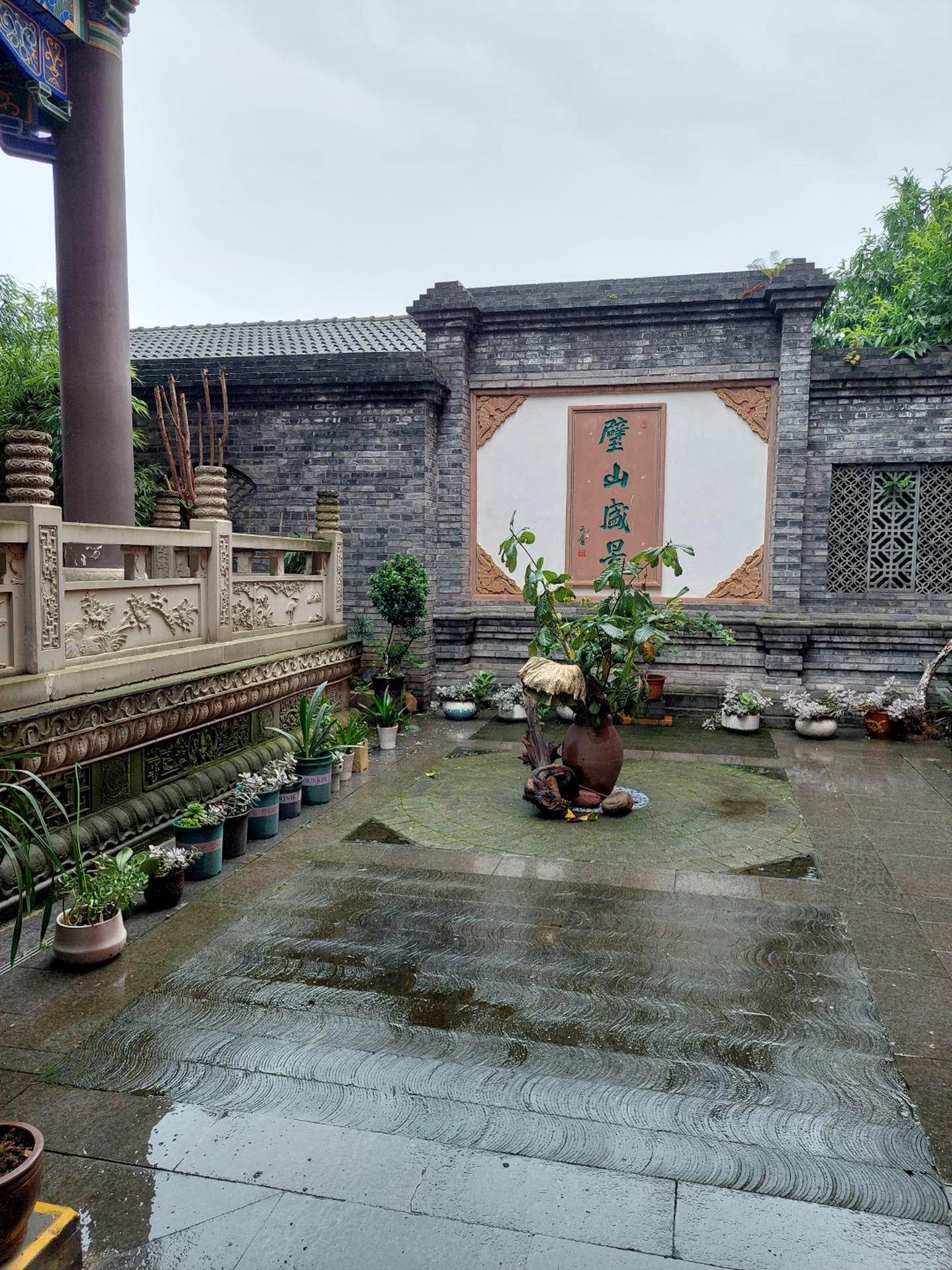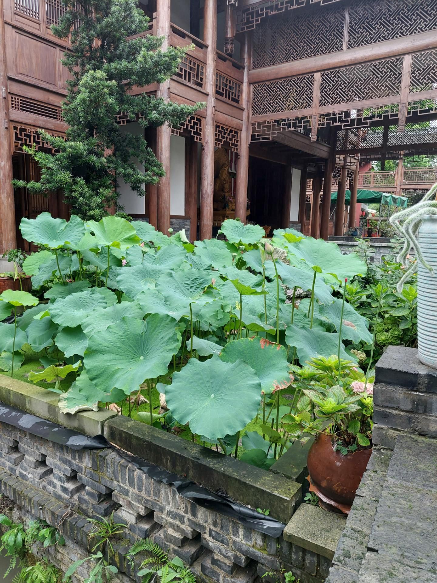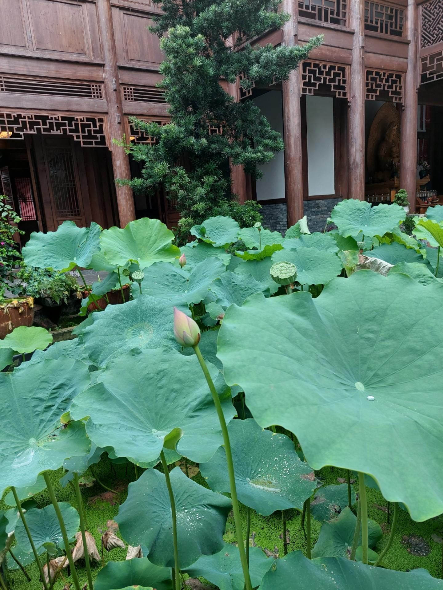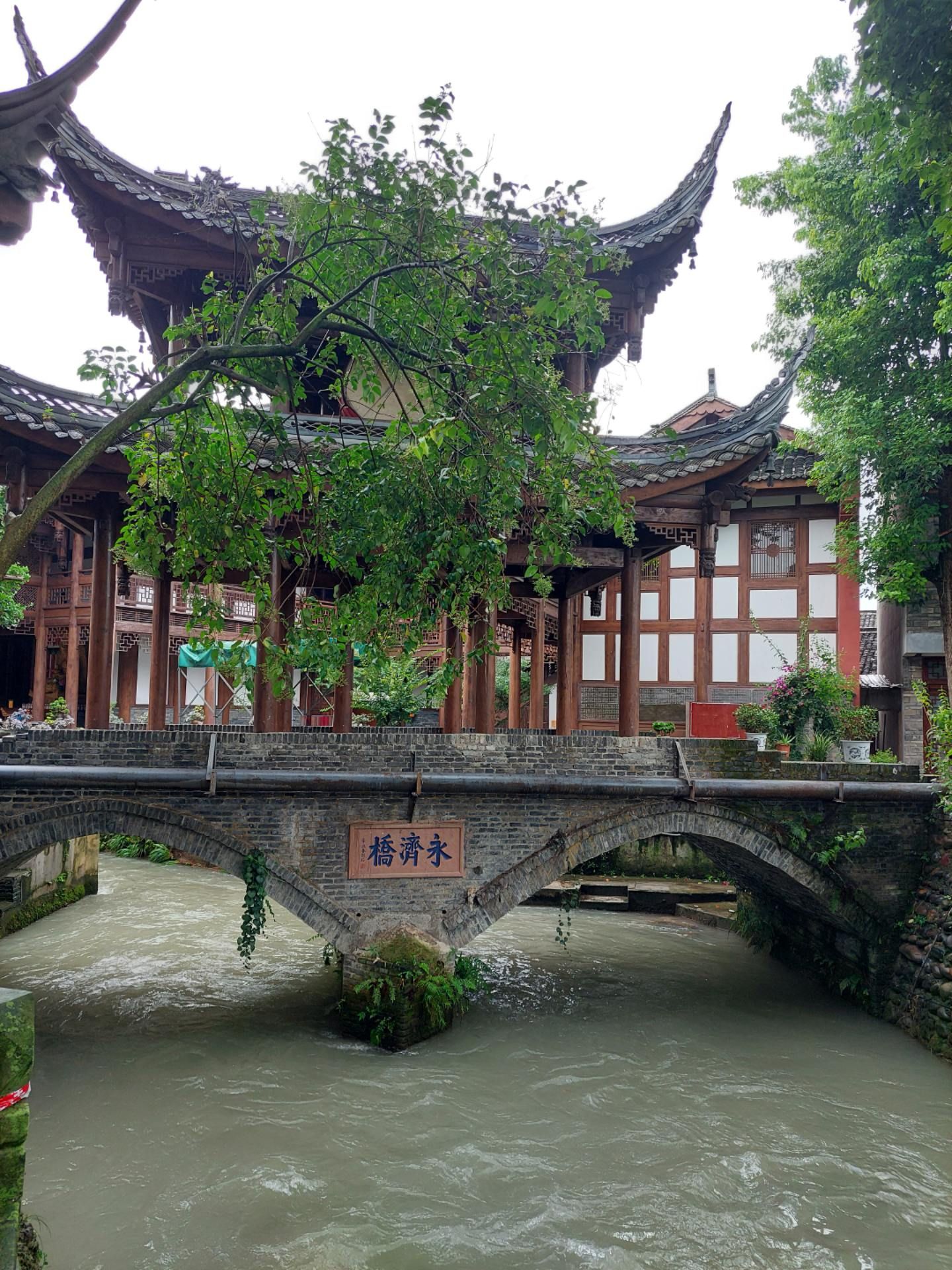 到了上场口左转再次回到二堰河边,不远处就看到了永济桥,桥上建有二层高的廊亭,一层作为桥的通道,廊桥二层架着壁山寺的法鼓。壁山寺也因为二堰河而分为两部分,寺内有一池碧荷,有的已结莲蓬,有的却含苞待放。壁山盛景小巧精致。顺二堰河又回到壁山寺门前路口。