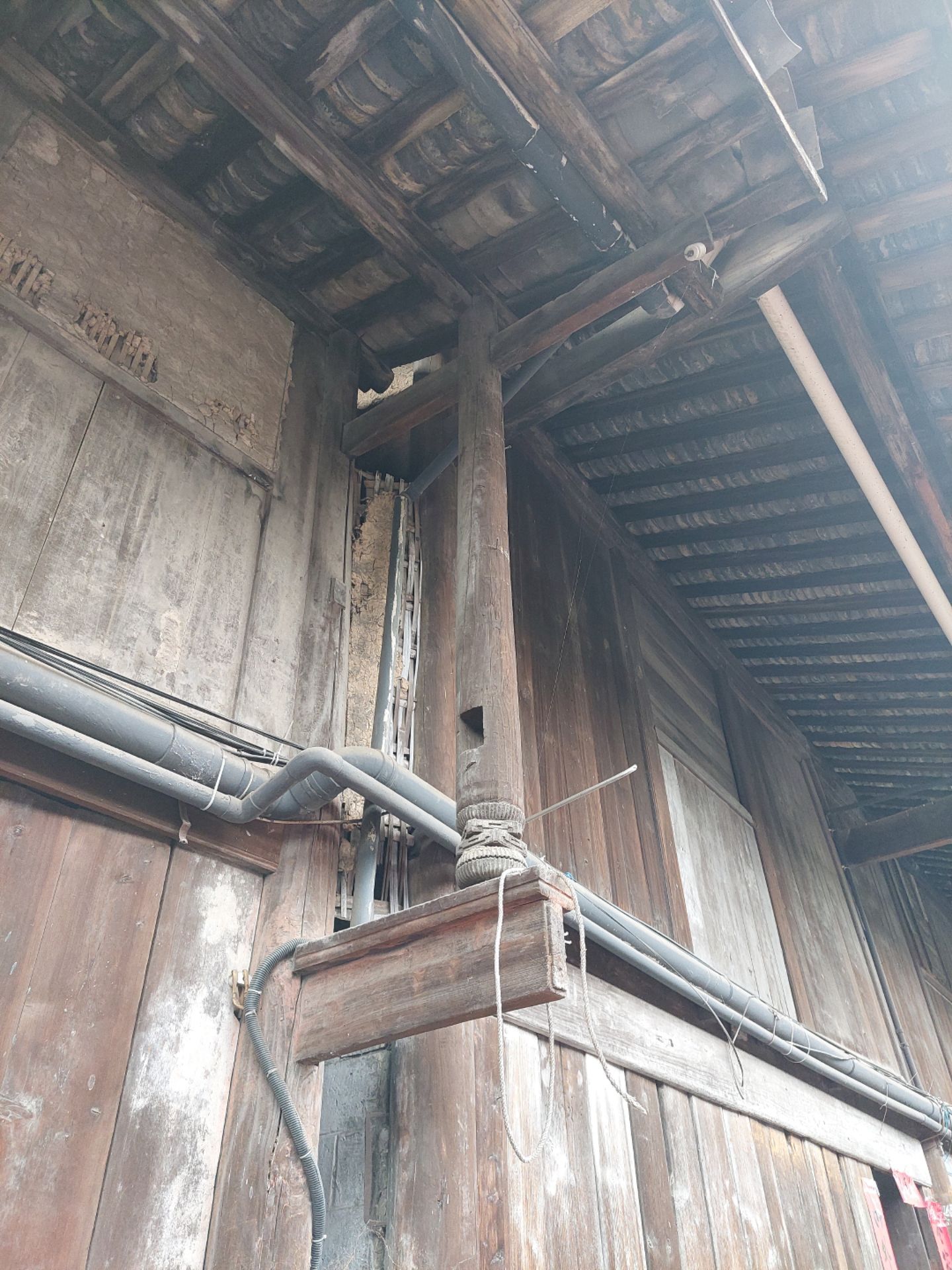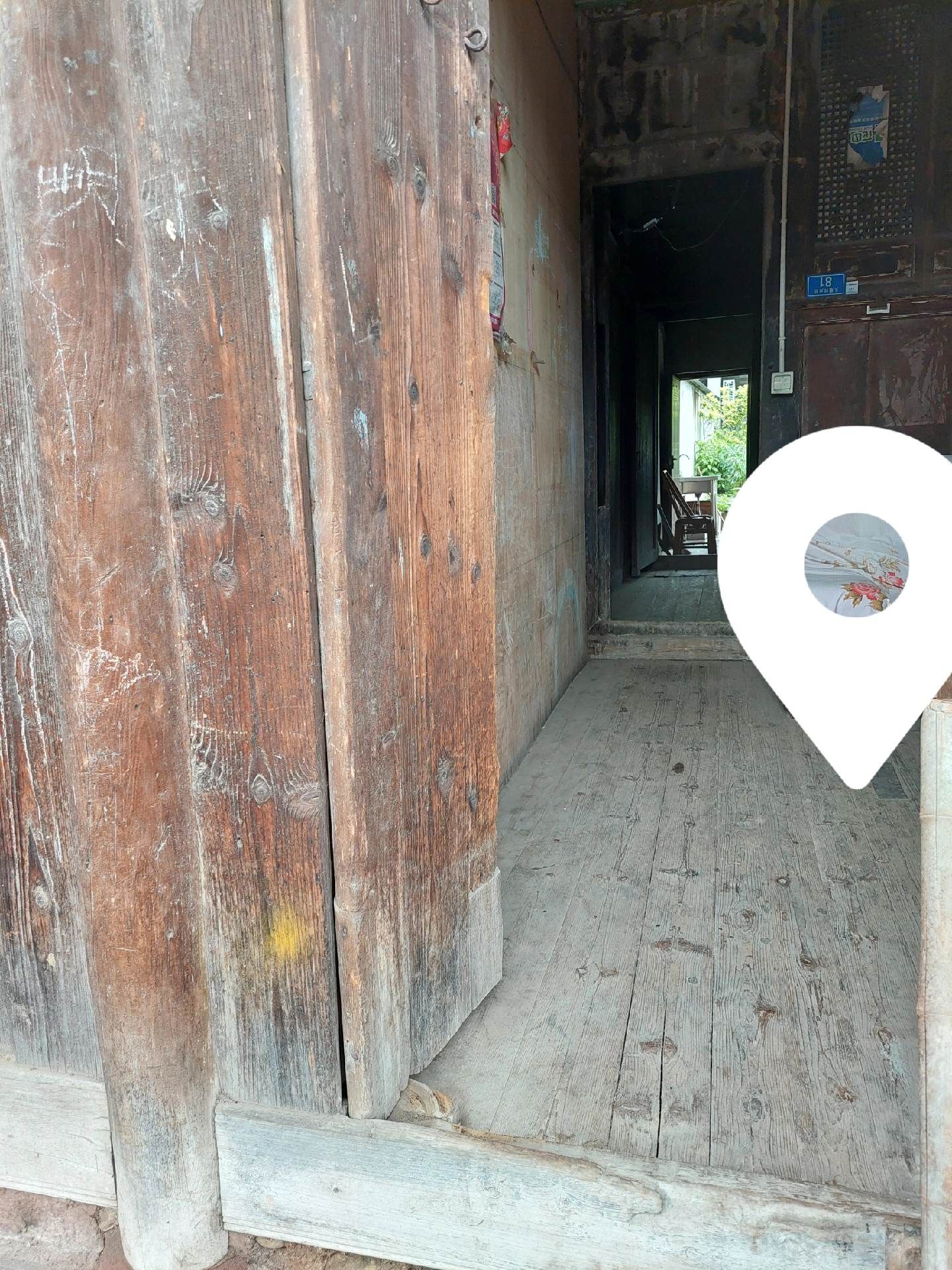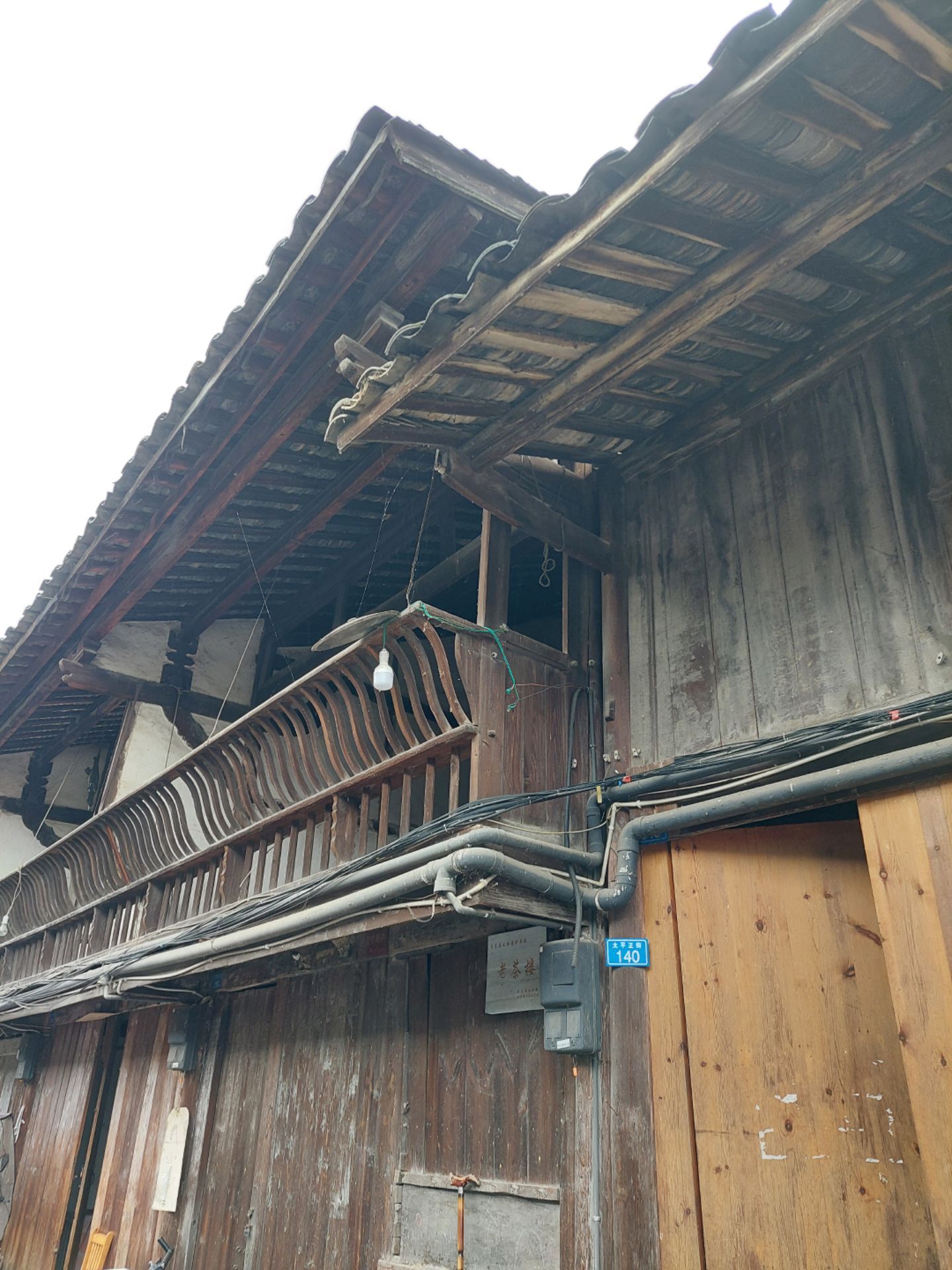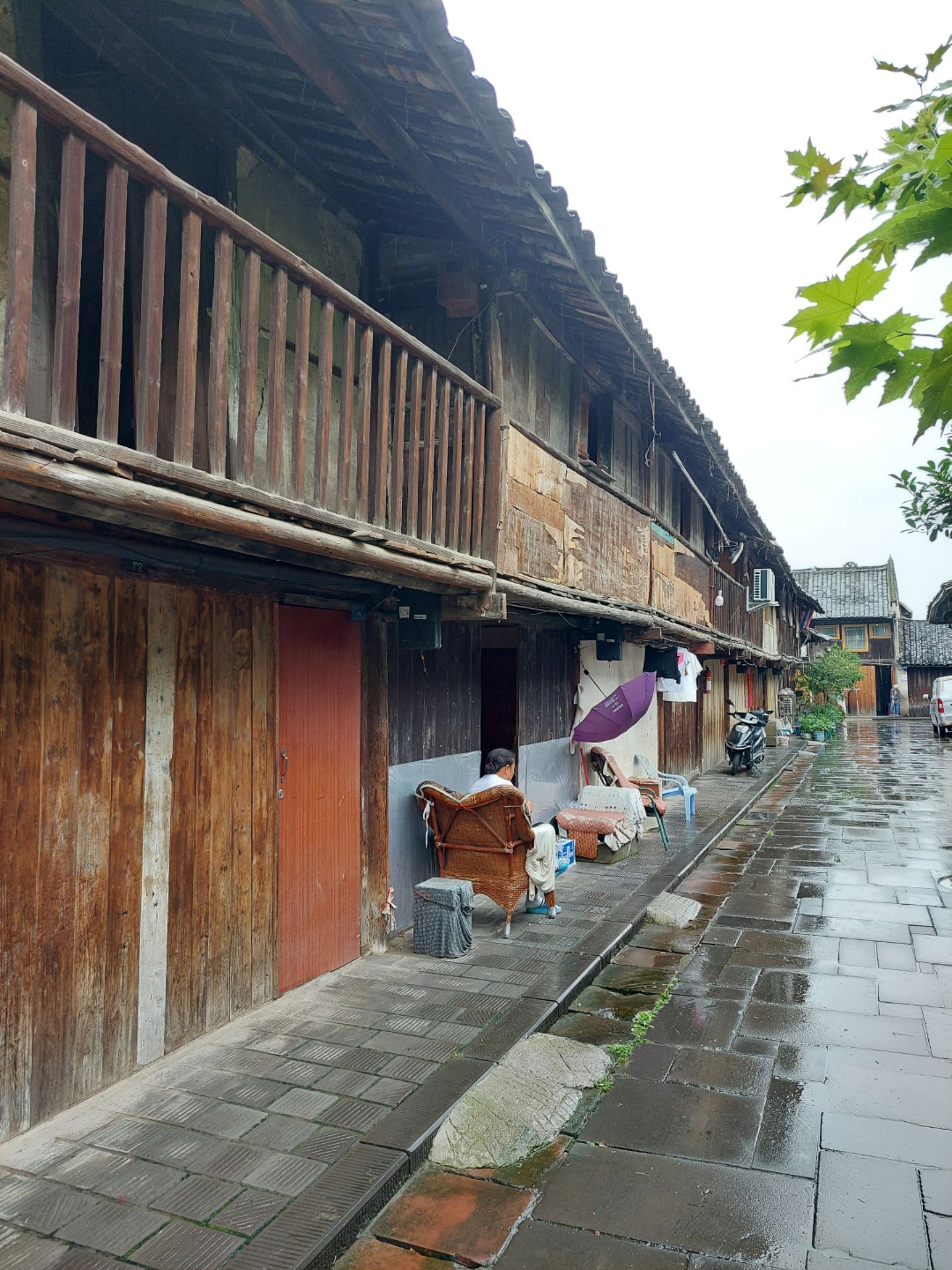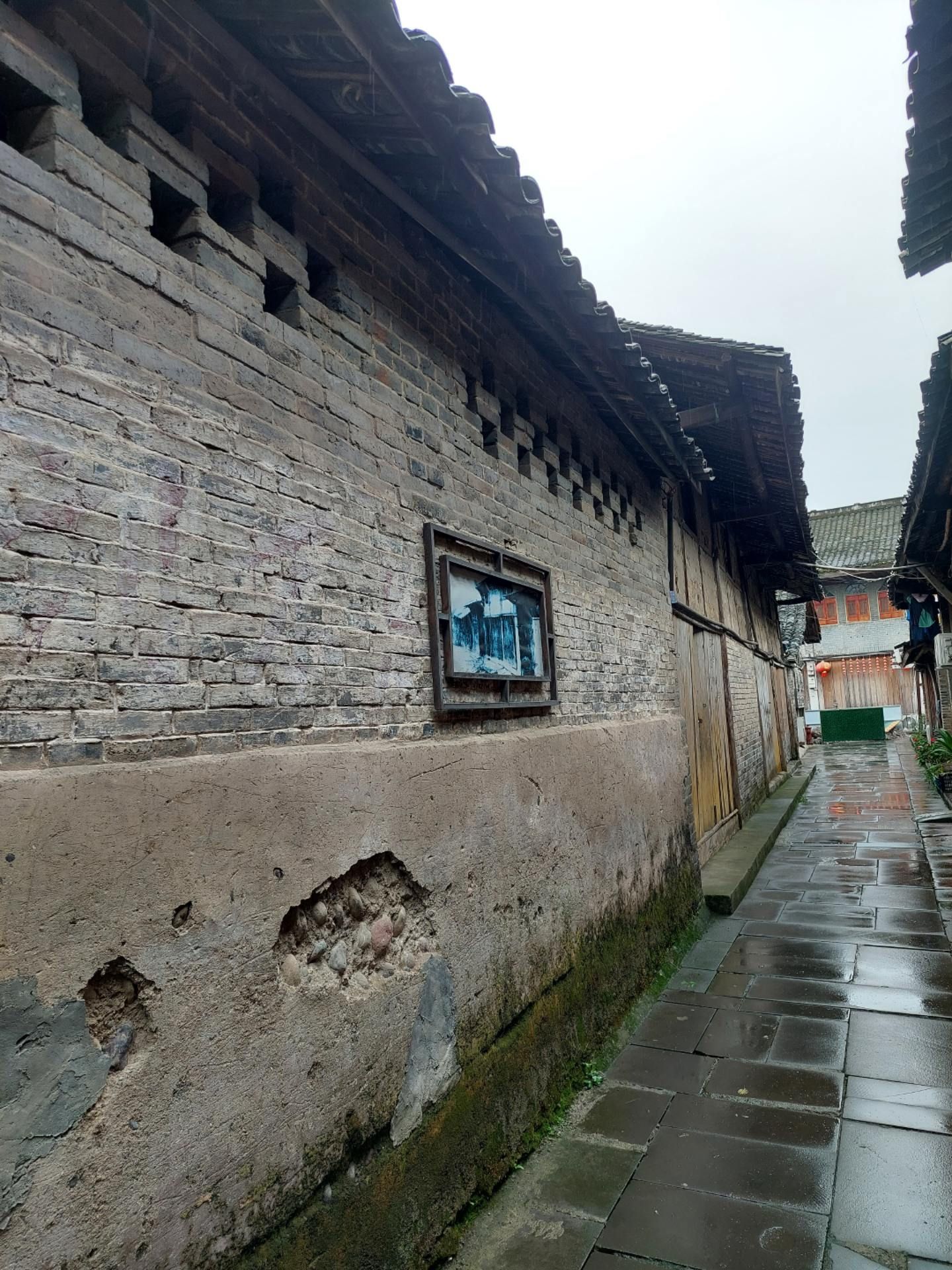 穿过横街,便看到了太平正街的老房子,这条街大部分都是明清风格、川西穿斗架构样式的陈旧建筑。雨后的青石板地面干净明亮,据一位本地老人讲:"这条老街,老屋大部分建于1934左右,部分是1910年左右建筑"。门前有半圆形或长方形的红色门槛台,门槛有近二十公分高,房间地板比门槛略低一些,地面上铺的是厚厚的木板。