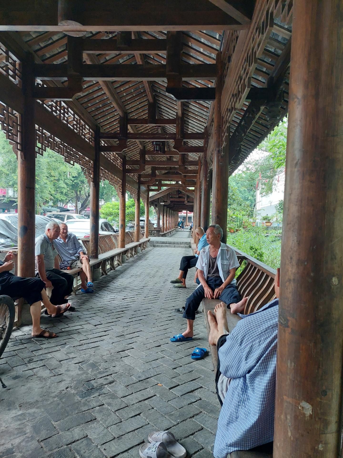 在牌坊街与下字库街口,二堰河边有条近五六十米的长廊,下雨天只有场镇上的几个老人聚在一起,或座、或半躺、或斜座的在廊桥上悠闲的摆着龙门阵。