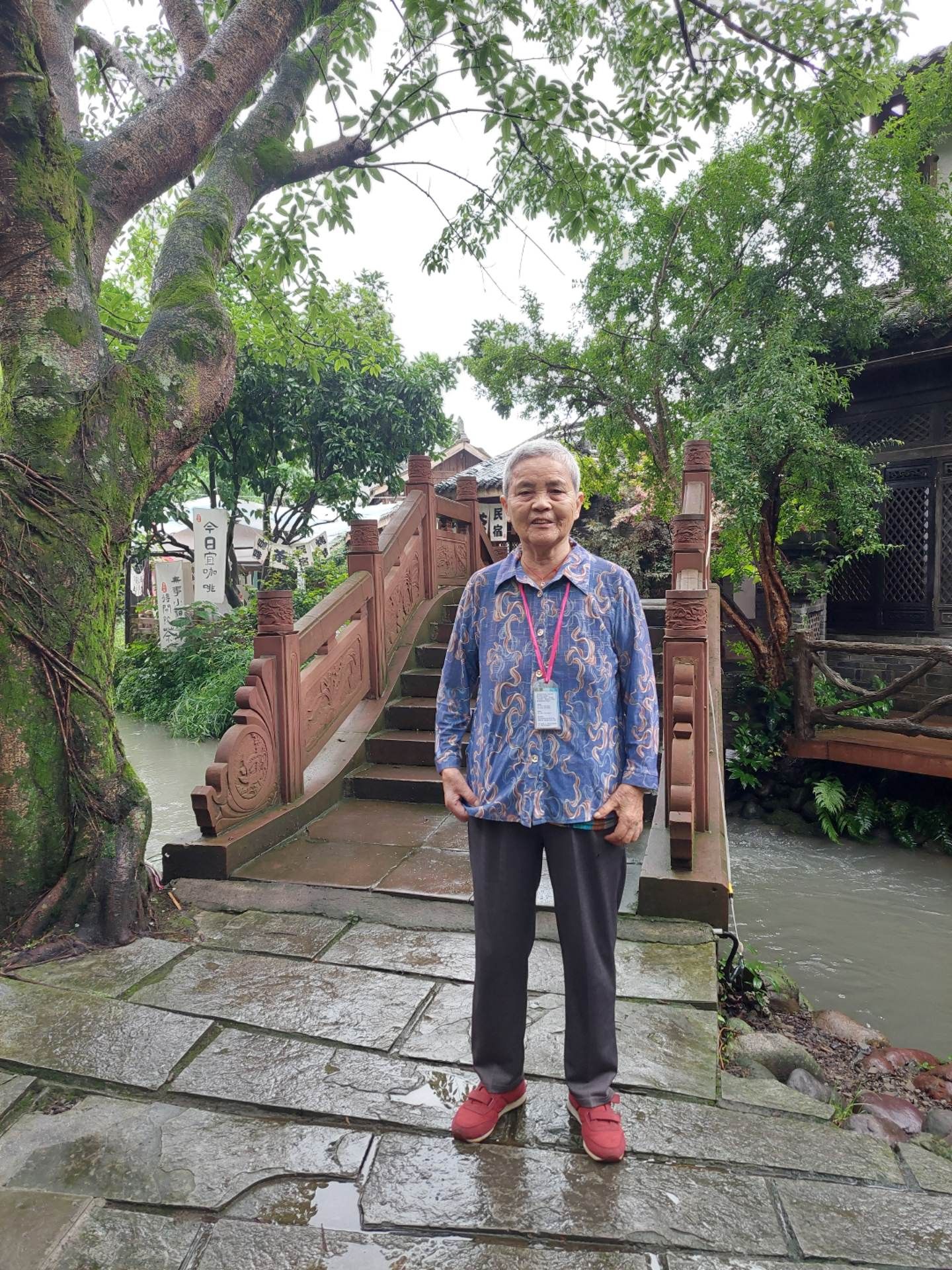 站在石桥上,看那上涨了的河水,冲刷着河道边坡旱柳绿植,漫步在雨中二堰河边清闲自在。走过长济拱桥,来到壁山寺门前,我往右走上古街,看到有位大姐正在古街屋檐下编织着毛线,红色毛线在她手中翻飞,现在这社会手工织毛线的人已经很少,织毛衣、围巾这在八九十年代很常见,我本以为织的是围巾,走进一问才知道大姐是在织毛线帽子。