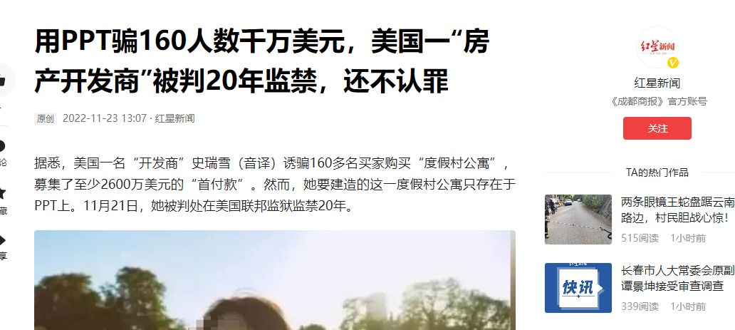 (信息来源:红星新闻 2022-11-23 《用PPT骗160人数千万美元,美国一“房产开发商”被判20年监禁,还不认罪》)