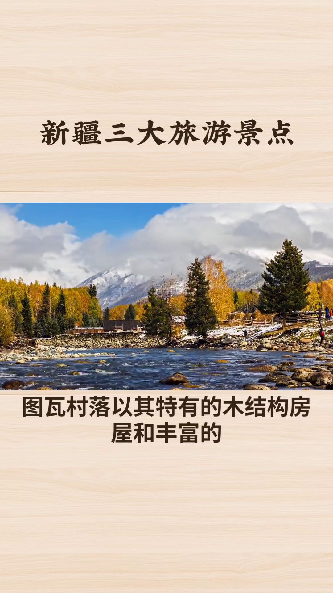 ·四、喀纳斯国家地质公园图瓦村落。喀纳斯是图瓦人的聚居地之一,这里保存着独特的北疆民族风情。图瓦村落以其特有的木结构房屋和丰富的民族文化成为游客必访之地。