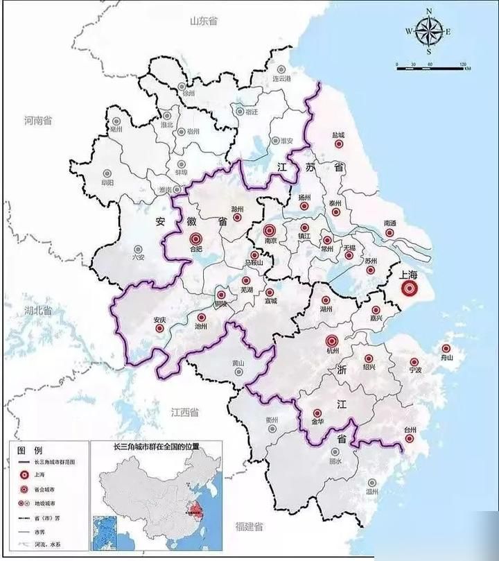 也就是上海周边开车300km内的区域,我画了一张图,大概的四至范围是南台州,北盐城,西南京宣城,西南千岛湖,东舟山。基本上相当于一个长三角一体化区域。