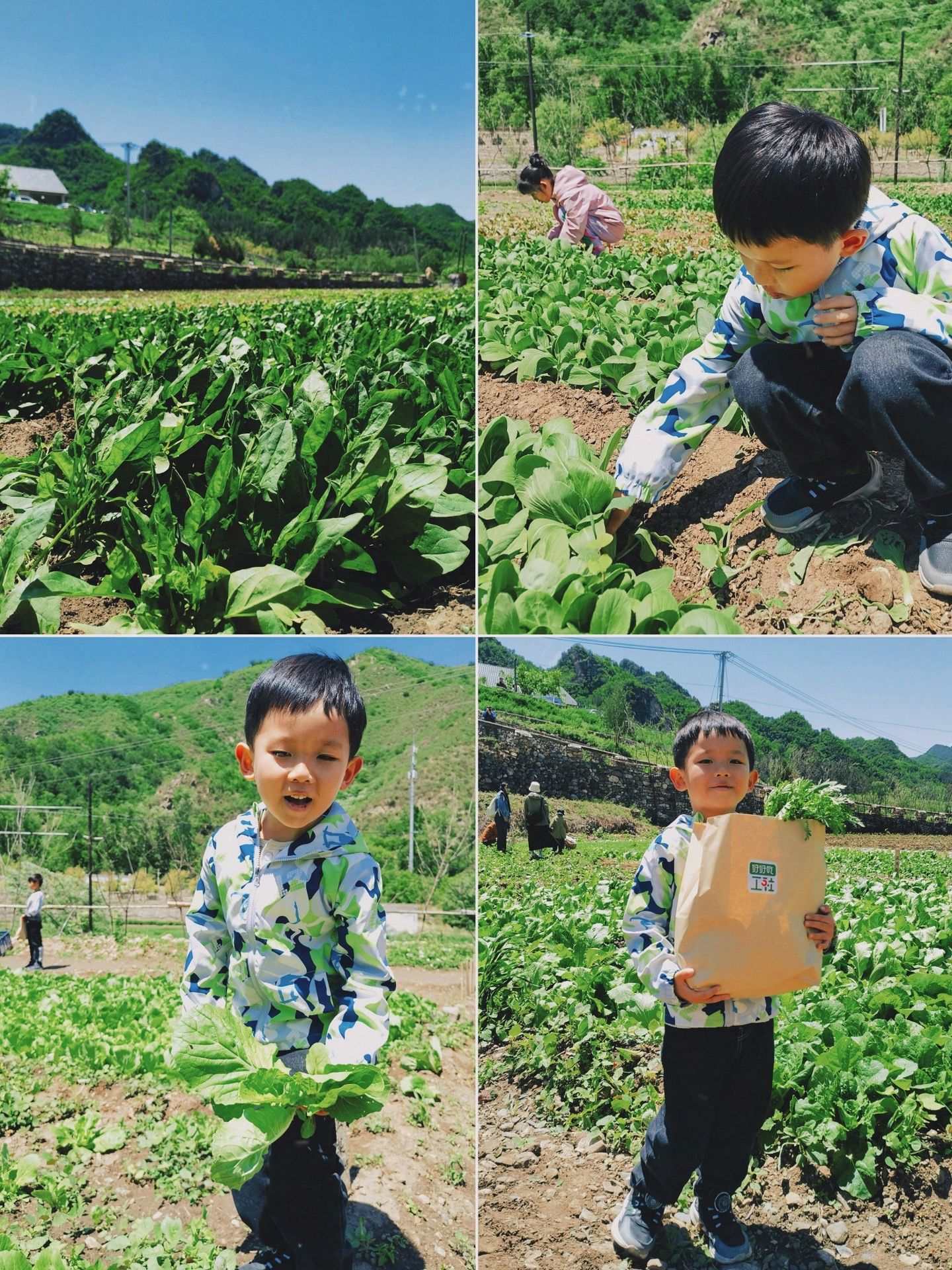 我们在民宿享用了两餐,晚餐是怀柔当地特色的非遗敛巧饭,而民宿自己还有菜地,餐食中的蔬菜等全部是来自自种的,不仅健康而且有“菜味”。管家还组织了小朋友去菜地采摘,走到田间地头也认识了很多不同种类的蔬菜,这种贴近自然乡野的体验,对孩子们来说有趣又很有教育意义