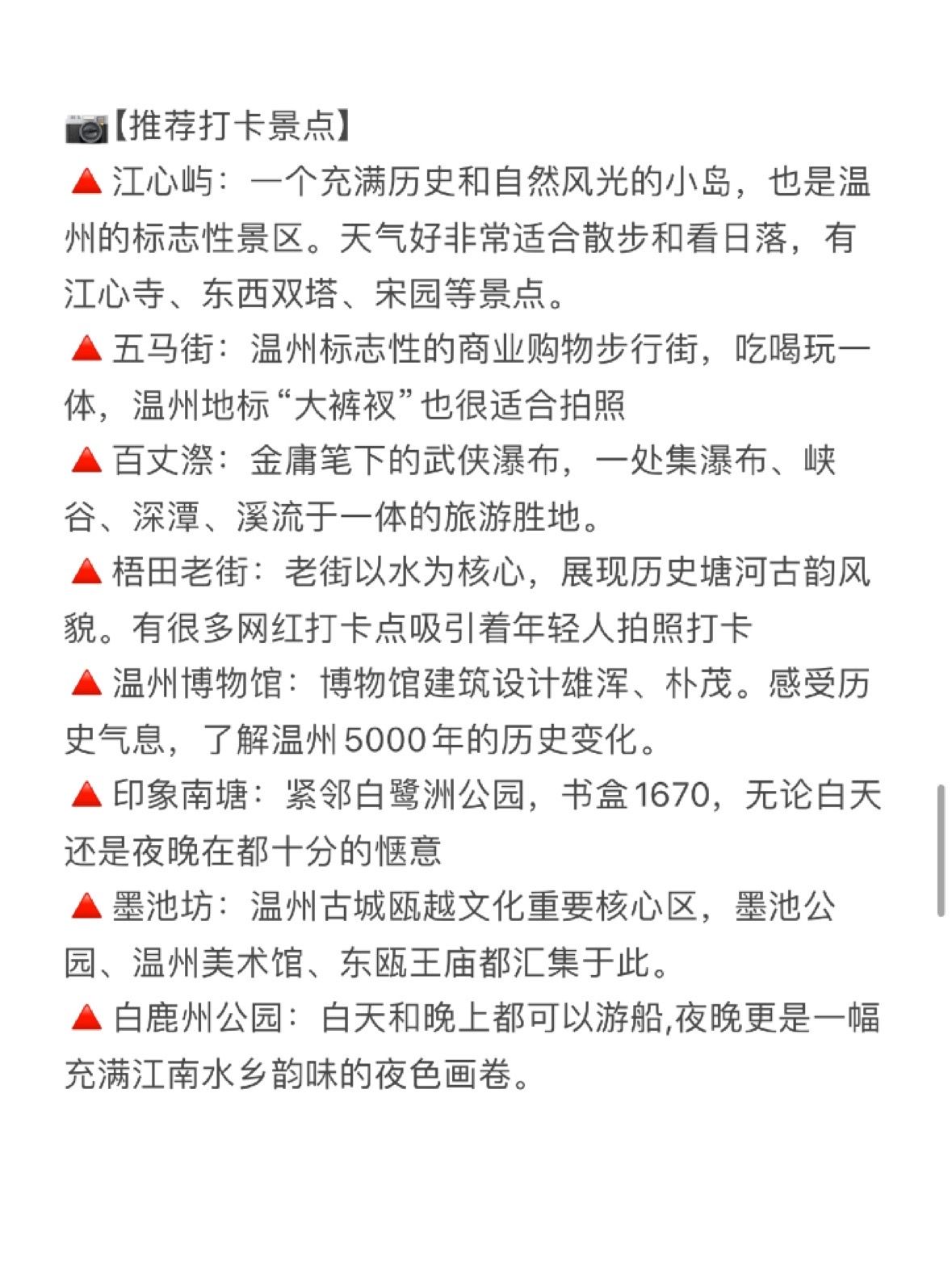 江心屿:一个充满历史和自然风光的小岛,也是温州的标志性景区。有江心寺、东西双塔、宋园等景点。
