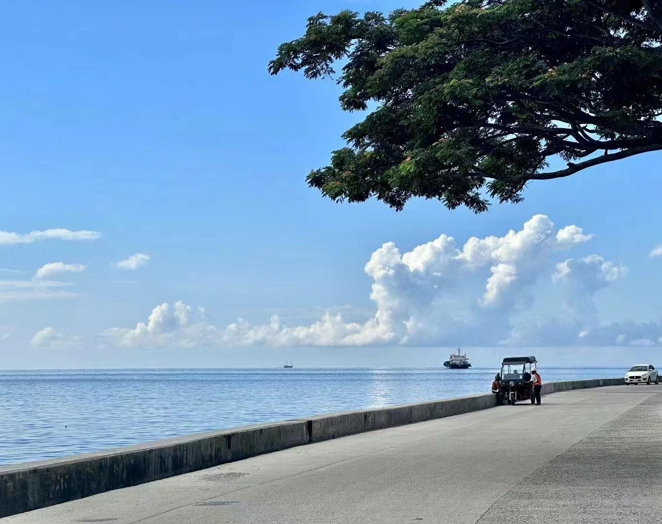 杜马盖地的天空犹如一块蓝宝石一般,镶嵌在碧海之中,绵羊状的白云在天上游走。湛蓝的海水清澈的一眼可以看到海底的石子。