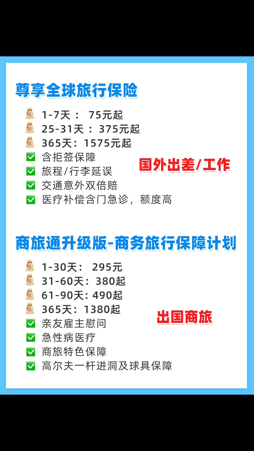 ·含拒签保障:国外出差/工作旅程/行李延误,医疗补偿含门急诊,额度高。