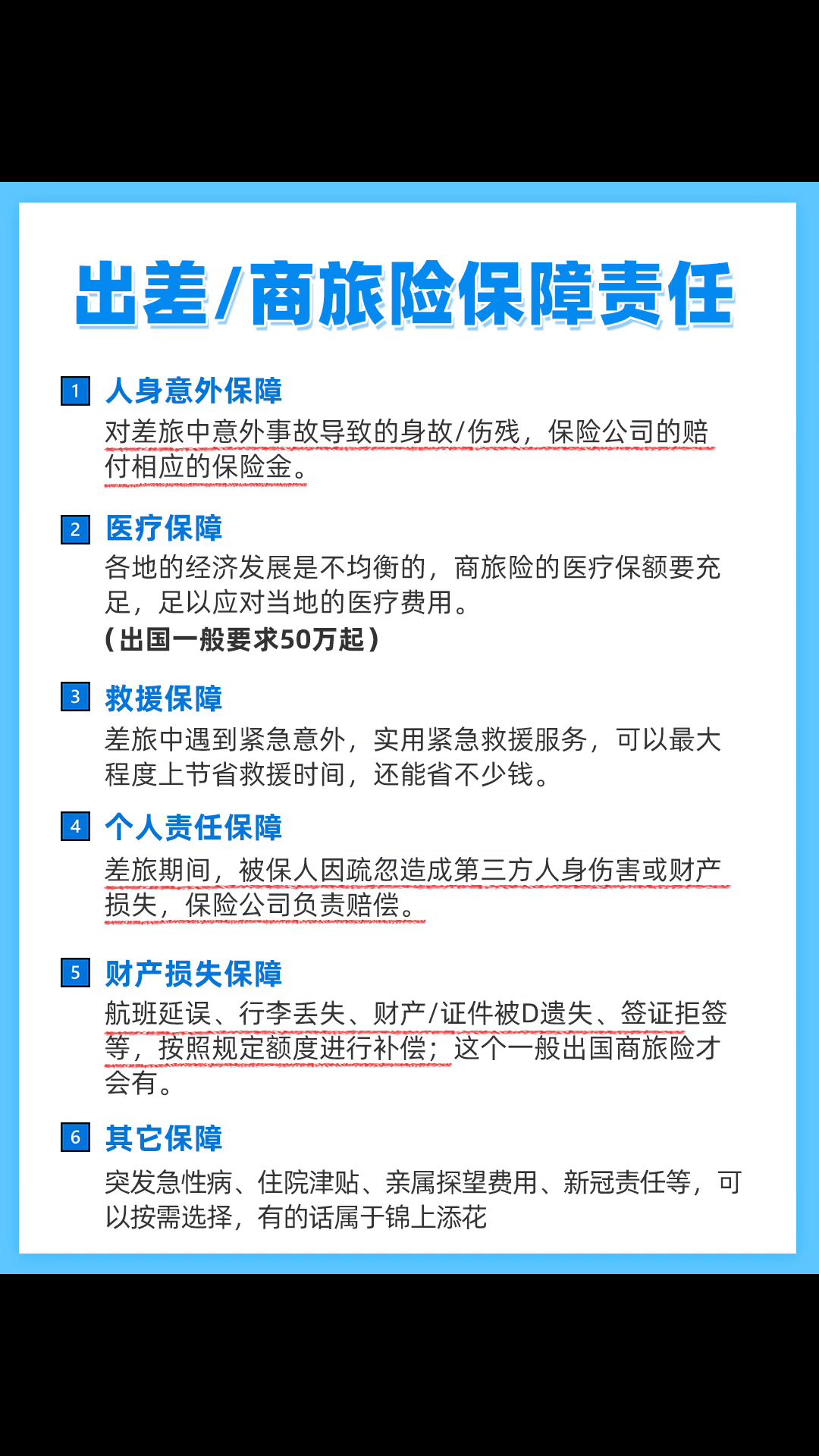 ·个人责任保障:差旅期间被保人因疏忽造成第三方人身伤害或财产损失,保险公司负责赔偿。航班延误、行李丢失、财产/证件被D遗失、签证拒签等,按照规定额度进行补偿;这个一般出国商旅险才会有。