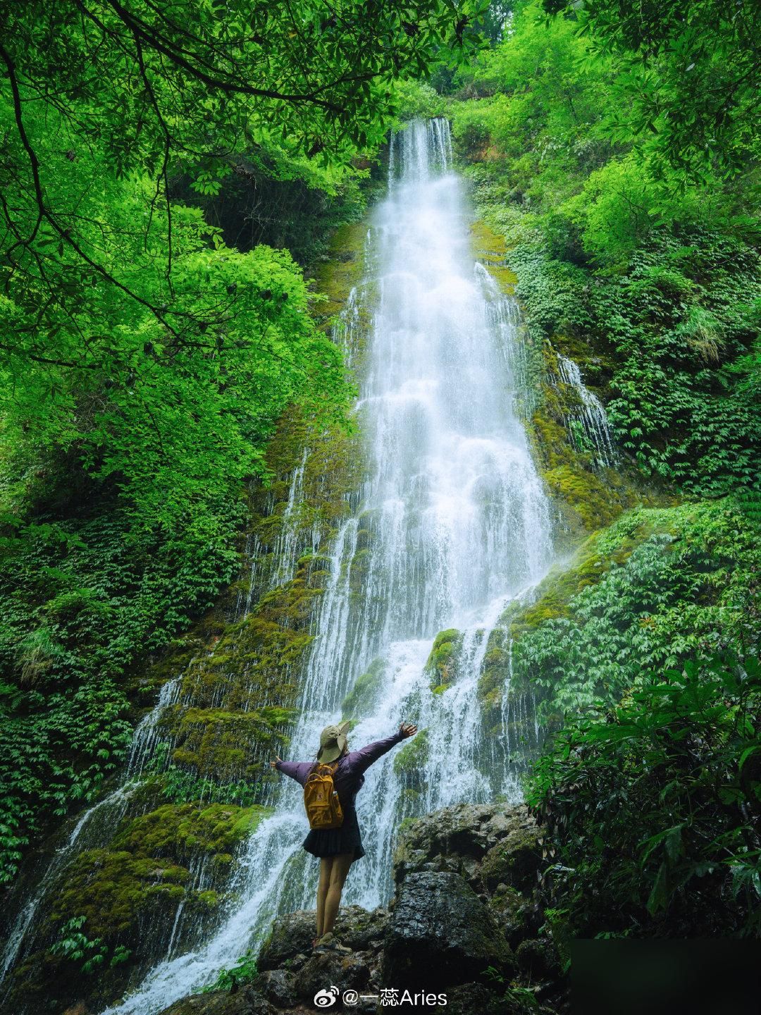 整个石壁被苔藓覆盖,瀑布飞流直下,超美!