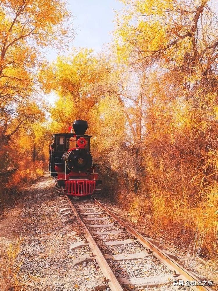 铁轨的左边是河流,右边是树林,可以买船票坐船游玩,另外在进入景区的时候就可以看到24米的观光台,20/人,可以看到胡杨林的全景,俯拍小火车经过。