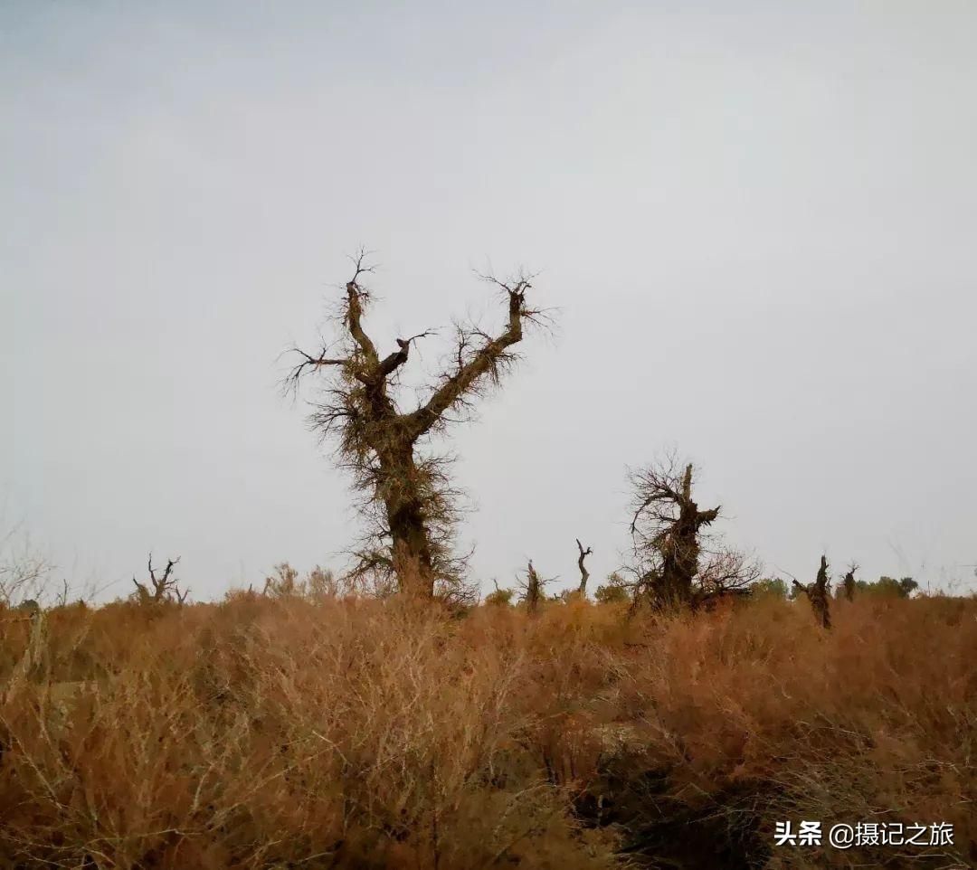 在景区大门口生长着一些更加苍劲有力的胡杨林,比起景区内依水而生的胡杨林,这些胡杨林看上去更像是一位饱经风霜的老者,