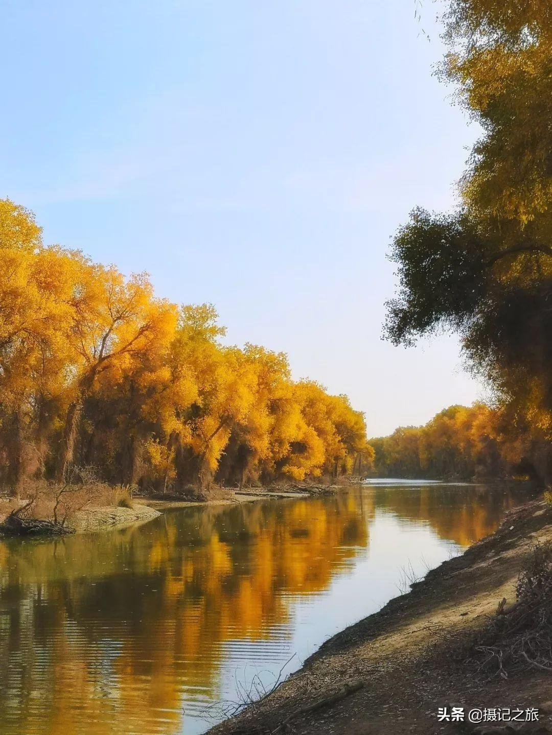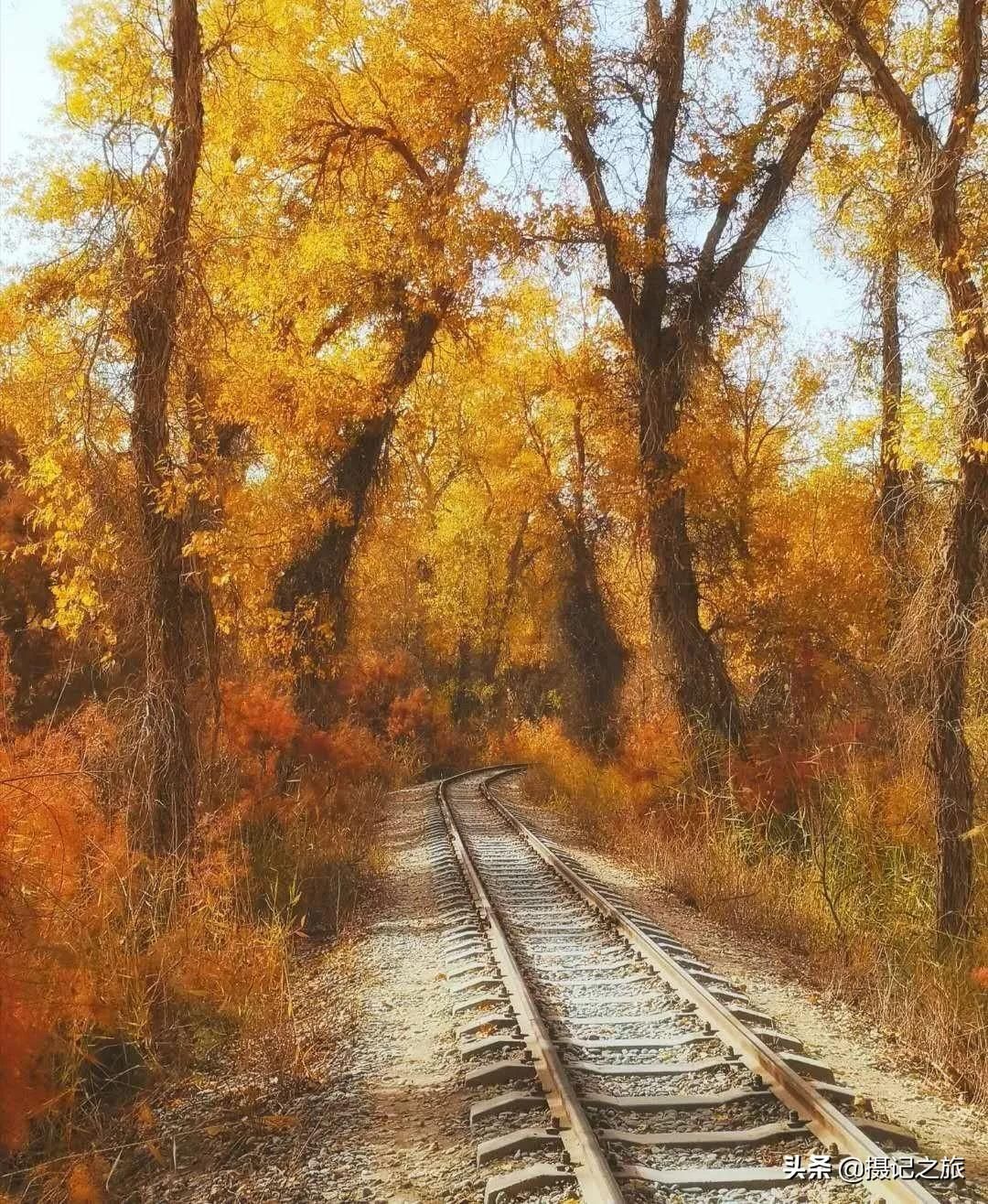 在铁轨左边河流的两旁也生长着许多胡杨林,借助河流,我们可以拍摄一些胡杨林的倒影,