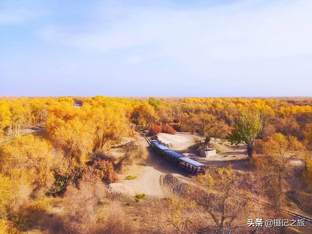 登上24米的观光台,静静等待小火车经过的时候,按下快门,俯拍小火车穿过万亩胡杨林。
