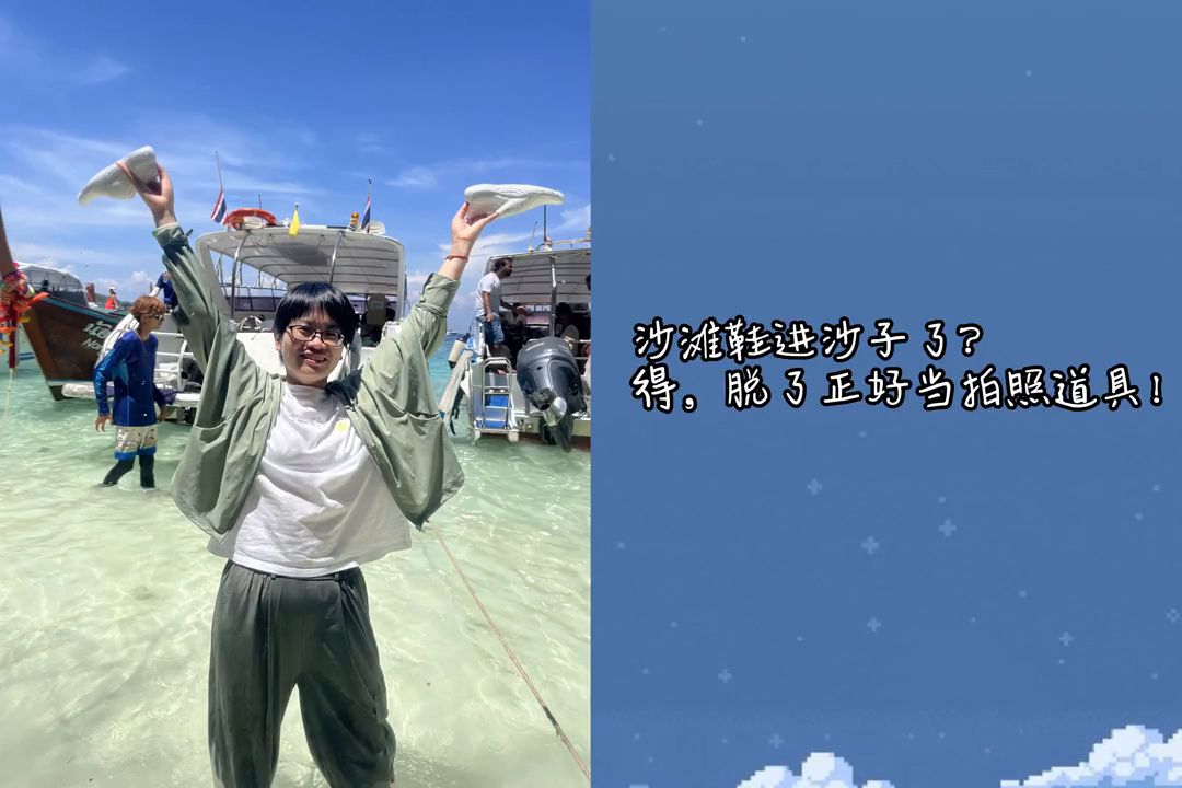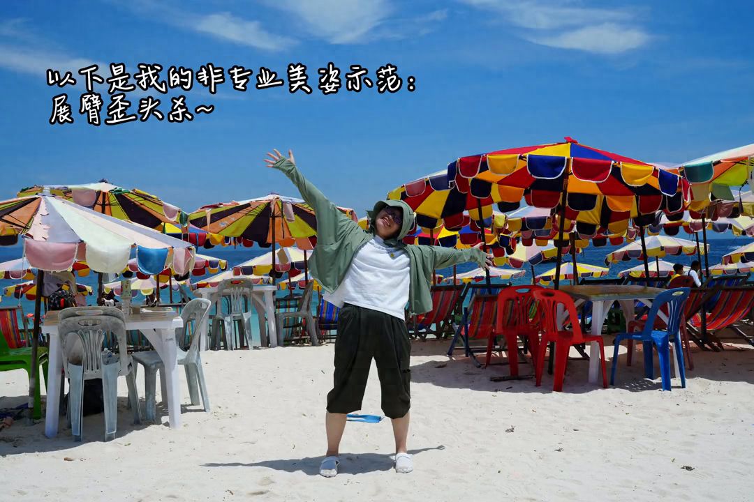 ·第一站来到的是鸡蛋岛,鸡蛋岛据说是私人海岛,海浪、沙滩、果冻海,我来啦。以下是我的非专业美姿示范:展臂歪头杀、曲臂歪头杀、动态仰头咧嘴笑、双手比耶背影杀、双手捏脸露齿笑。沙滩鞋进沙子了?得,脱了正好当拍照道具。拍累了就默默欣赏路人小哥潜水。