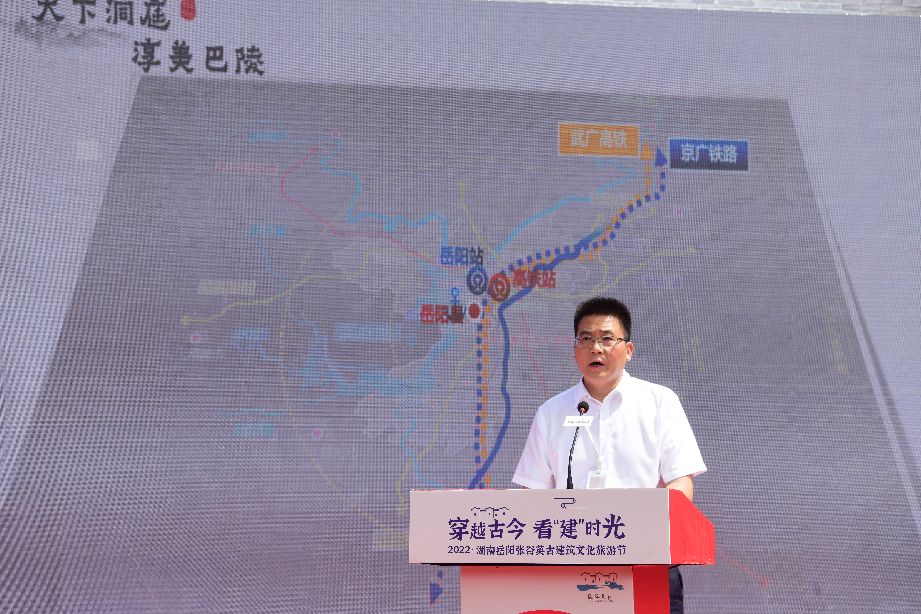 7月2日上午,“穿越古今 看"建'时光” 2022·湖南岳阳张谷英古建筑文化旅游节开幕式在岳阳张谷英村当大门广场前举办。开幕式上,岳阳县委书记肖湘晖以“天下洞庭·淳美巴陵”的旅游品牌为主题,向到场各位推介岳阳县全域旅游。