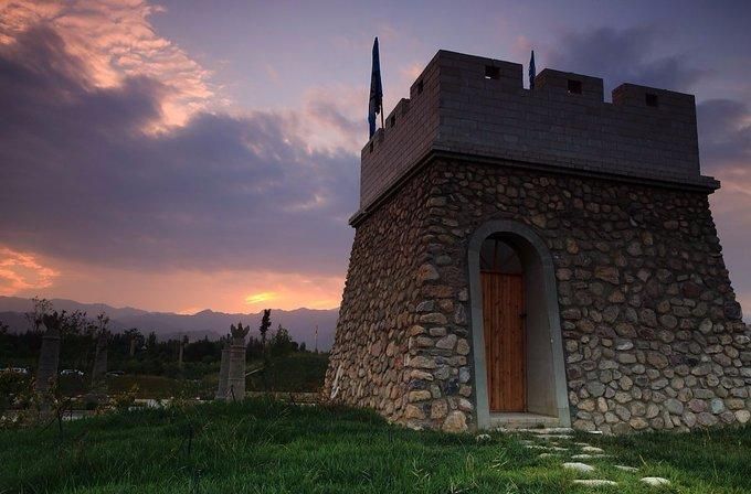 大门口的碉楼据说是以西夏王朝的碉楼为原型,用贺兰山石筑造而成。右边碉楼顶部为西夏建筑特有的顶部形式。
