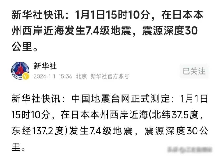 日本元旦当天发生了一场强震,震级高达7.6级,震中位于西部沿海的石川县