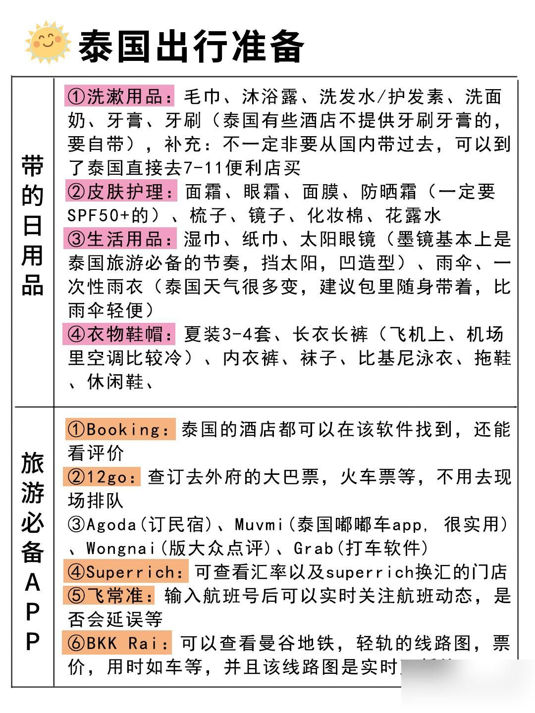 身份证、护照、手机、耳机、充电线、充电宝、泰铢或人民币现金、泰国电话卡