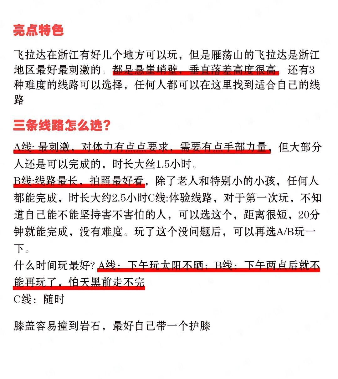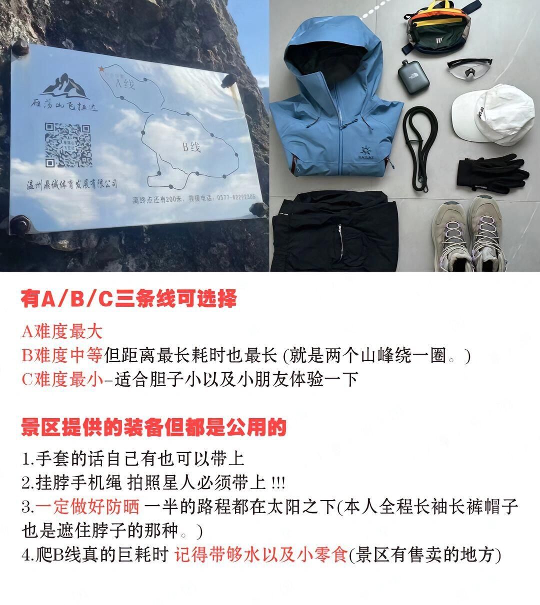 8. 拍照注意:如果想拍出好看的照片,可提前练习一些动作。在拍照点可以使用长的备用锁扣来摆拍各种动作,需注意姿势,避免撅屁股。a/b 线路拍照大多需同伴互相拍照,可准备质量好的手机挂脖悬挂绳。另外,c 线有景区摄像师拍照,可提前预约,避免现场长时间排队等待。