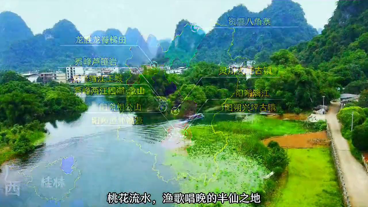 ·阳朔县:世外桃源。桃花流水,渔歌唱晚的半仙之地。侗乡风情原始的形态,秀美的山水田园风光,桃花源的另一种展现。