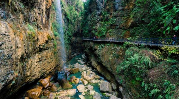恩施地心谷,这是清江大峡谷的一个新景区,比其他同类景区更加秀美,这里有碧绿清江、洁白的瀑布、独特的喀斯特地貌,风景十分秀丽。