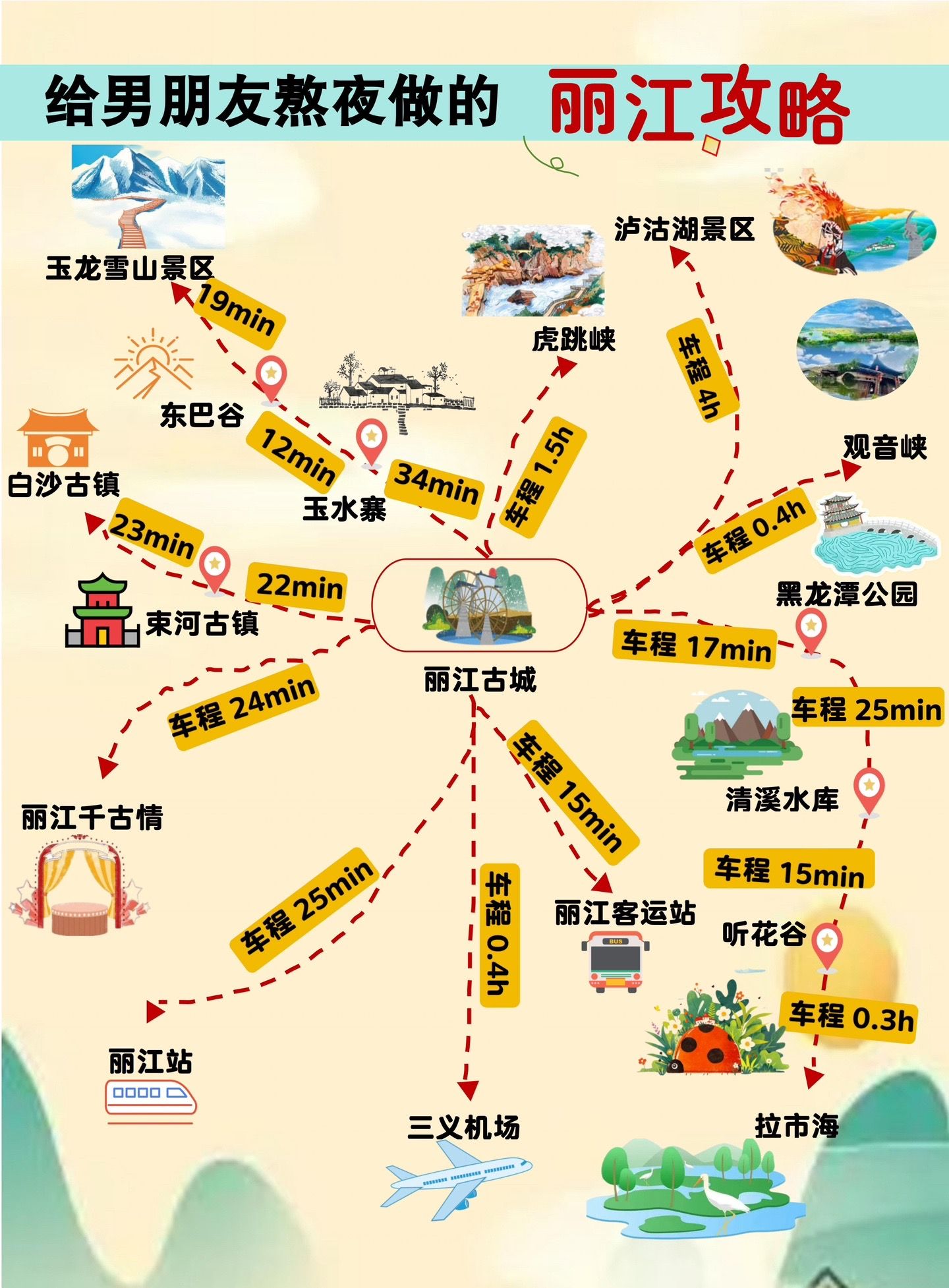 还给大家贴心地标出了距离丽江古城的出行时长。并且还详细的给大家介绍了玉龙雪山景区和丽江古城的游玩指南!![派对R][派对R]
