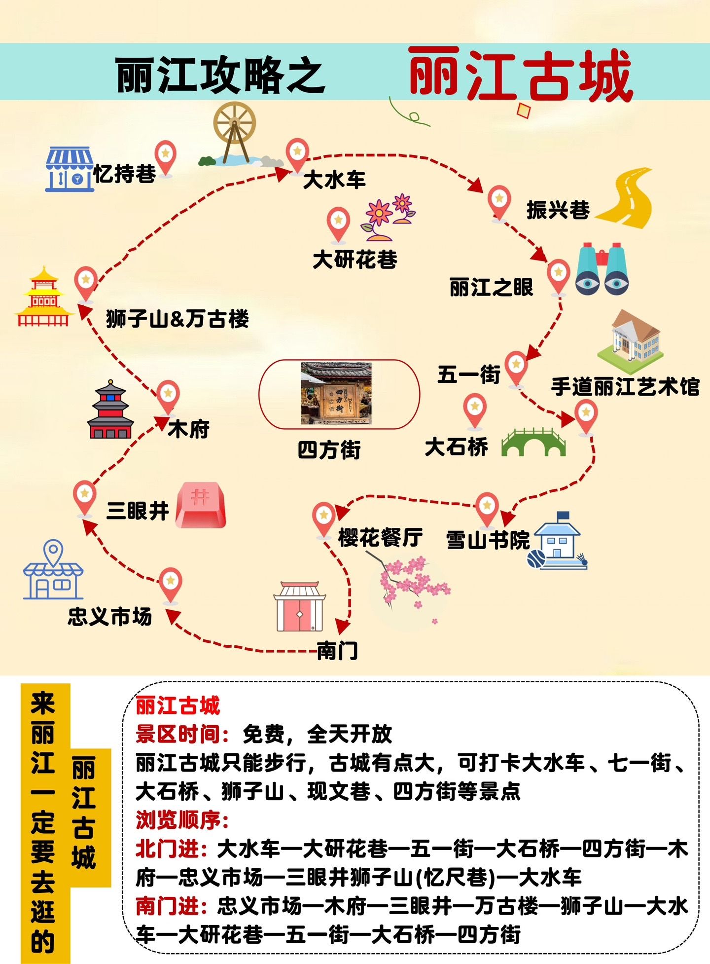 南门进:忠义市场-木府一三眼井一万古楼一狮子山一大水车一大研花巷一五一街一大石桥一四方街