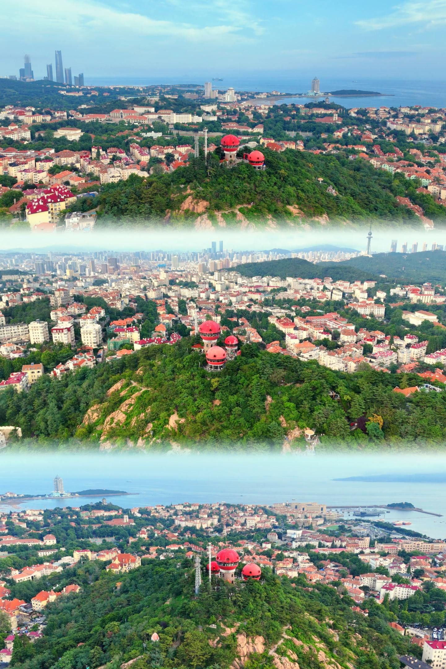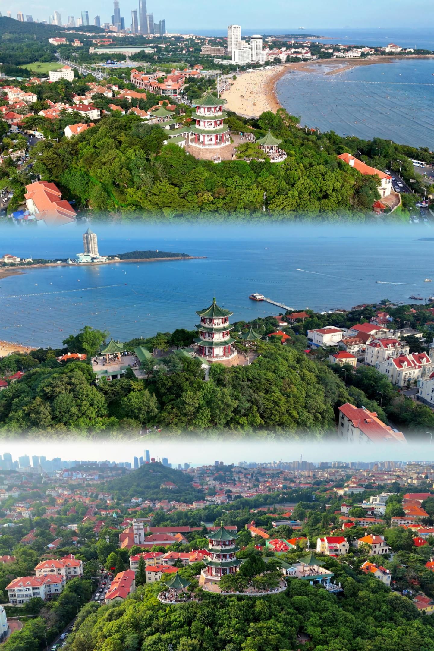 小鱼山:能清楚的看到第一海水浴场月牙沙滩、中山公园电视塔、海天和老城古今同框,有三层亭子,看海看日落完全无遮挡