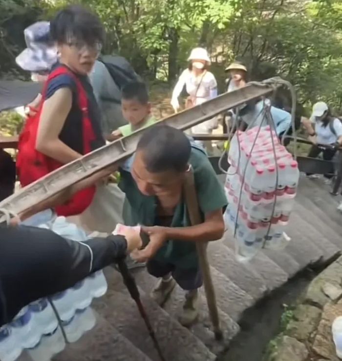 “为什么要给我们钱?”他们心里可能在想。女子笑着解释道:“你们这么辛苦,我只是想表达一下我的敬意。”这些挑山工或许一辈子都习惯了默默付出,从来没想过会有人愿意因为他们的辛劳而付出回报。