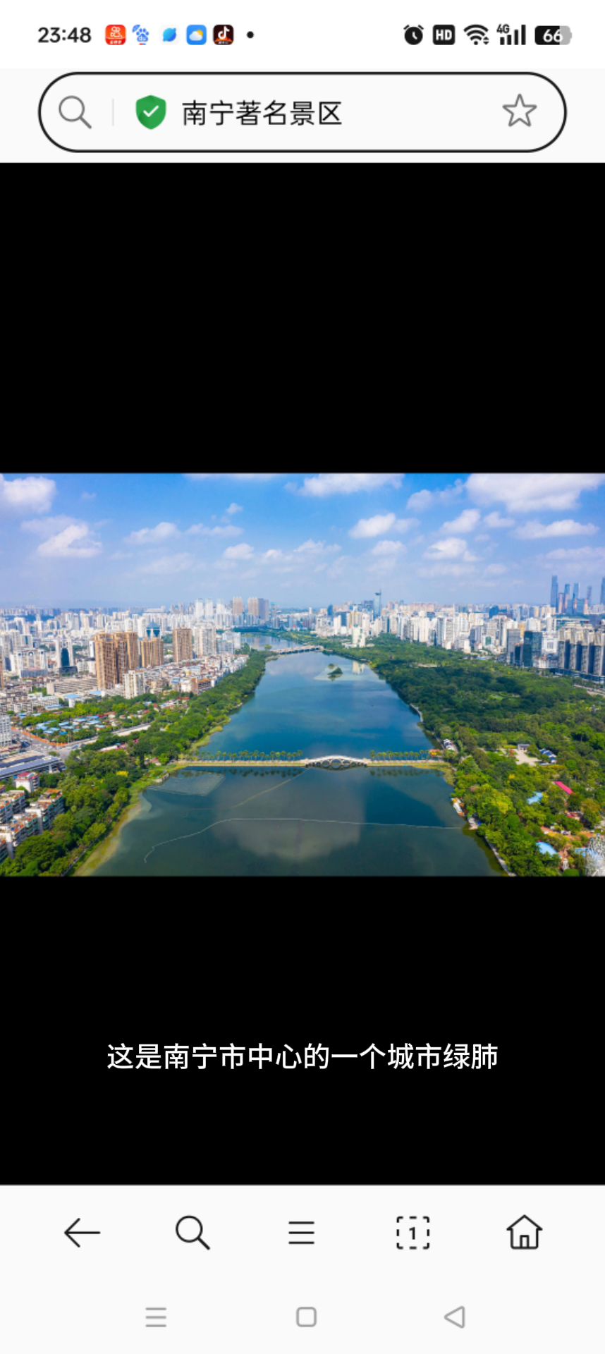 我们现在在南湖公园,这是南宁市中心的一个城市绿肺。南湖公园的面积很大,占地100公顷,湖面面积占了2/3。这里的人工湖水清澈见底,湖面上有各种游船,还有各种水上娱乐设施。湖边的垂柳随风飘荡,湖中的荷花亭亭玉立,景色宜人。这里还有各种花卉展览,如牡丹、玫瑰、百合等,让人心旷神怡。