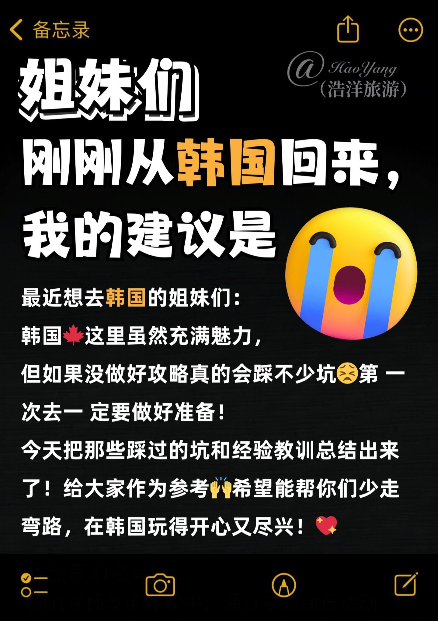想去韩国的姐妹们看过来!韩国有着时尚的都市、迷人的风景和美味的美食。但如果没做好攻略,真的会踩不少坑哦。今天,我把自己踩过的坑和总结的经验教训都分享出来,给大家作为参考。希望能帮你们少走弯路,在韩国玩得开心又尽兴!