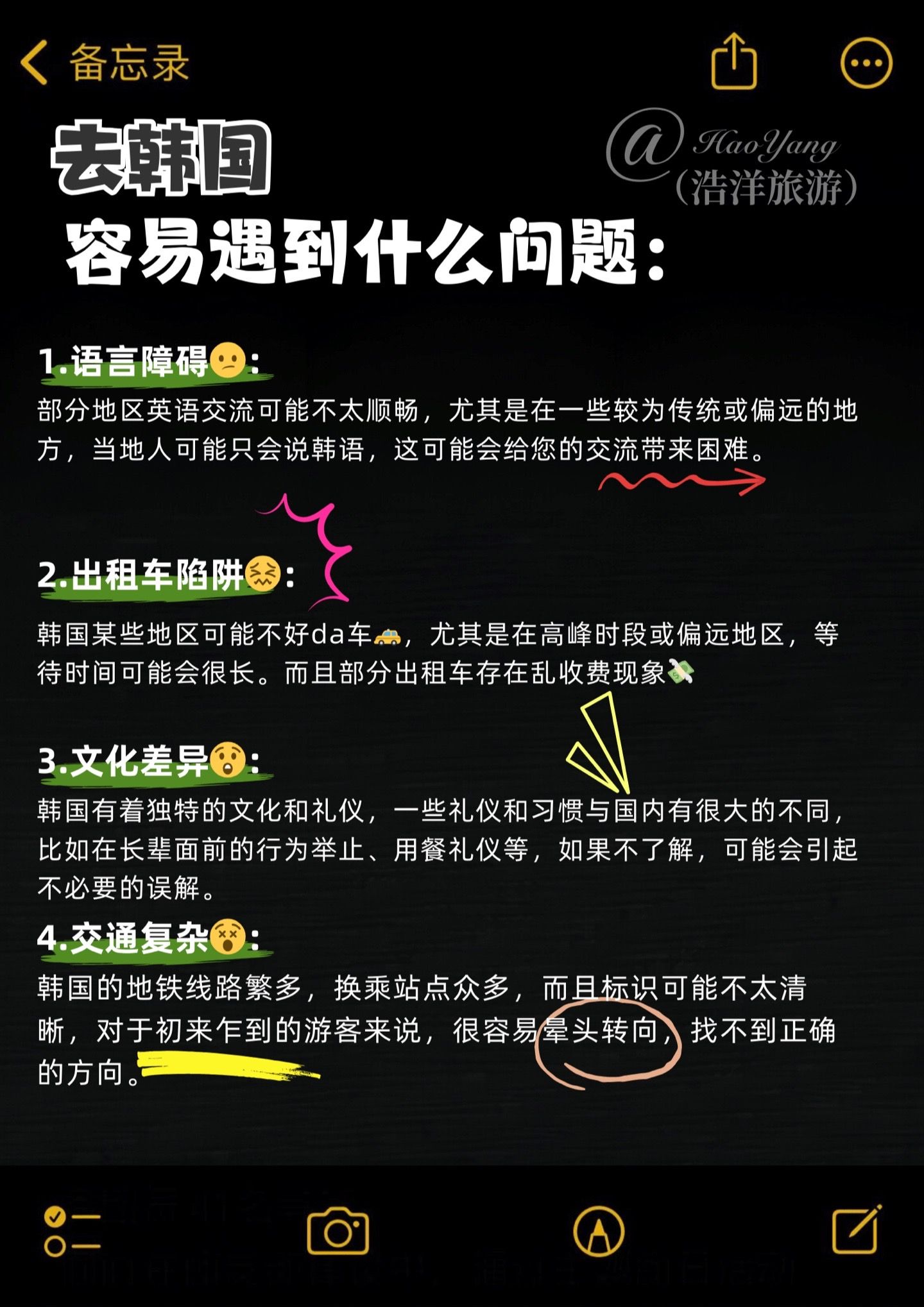 语言障碍:虽然韩国有很多人会说英语,但在一些小地方或者餐厅,可能会遇到语言不通的情况。可以准备一些常用的韩语短语,或者使用翻译软件。