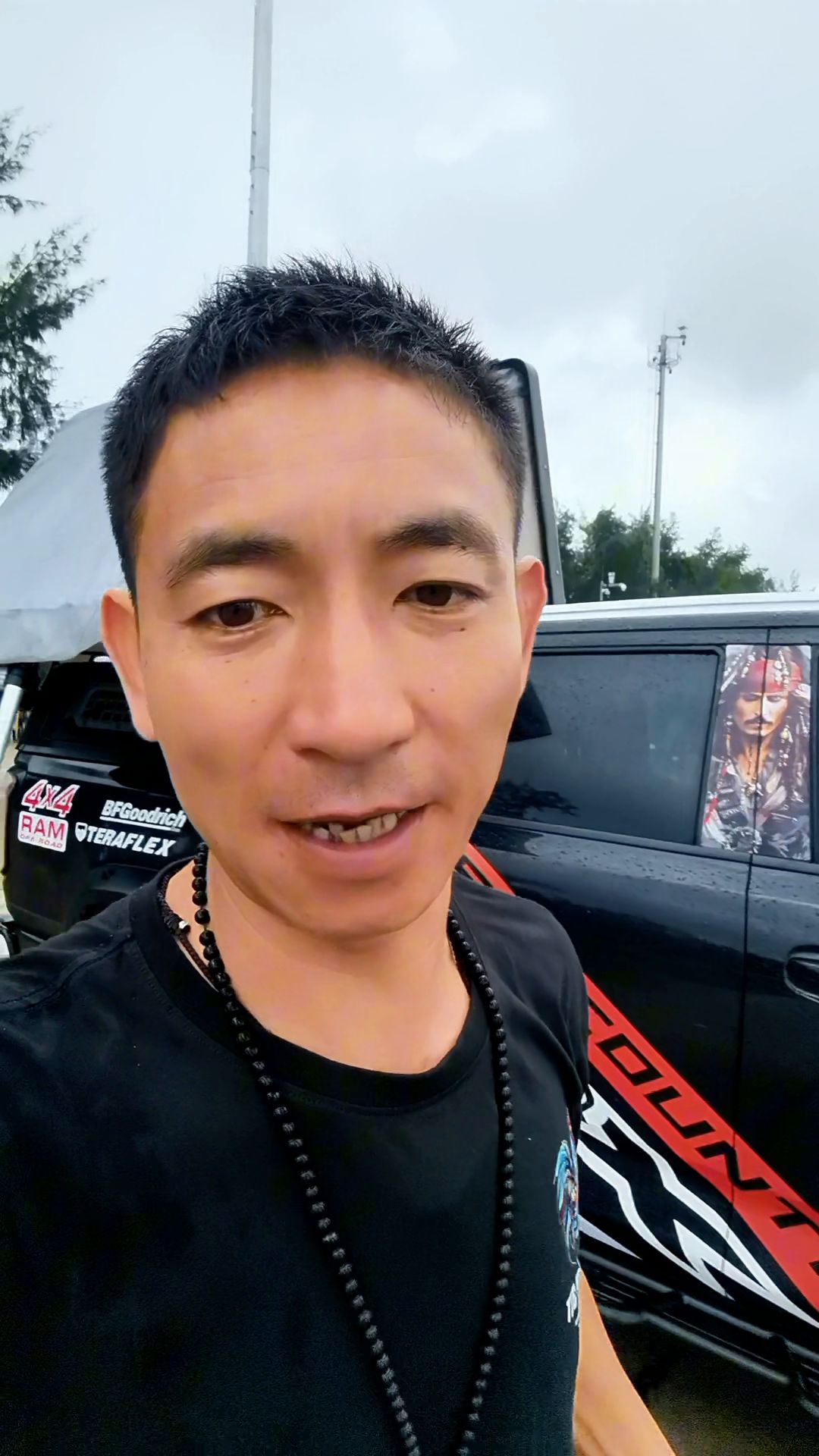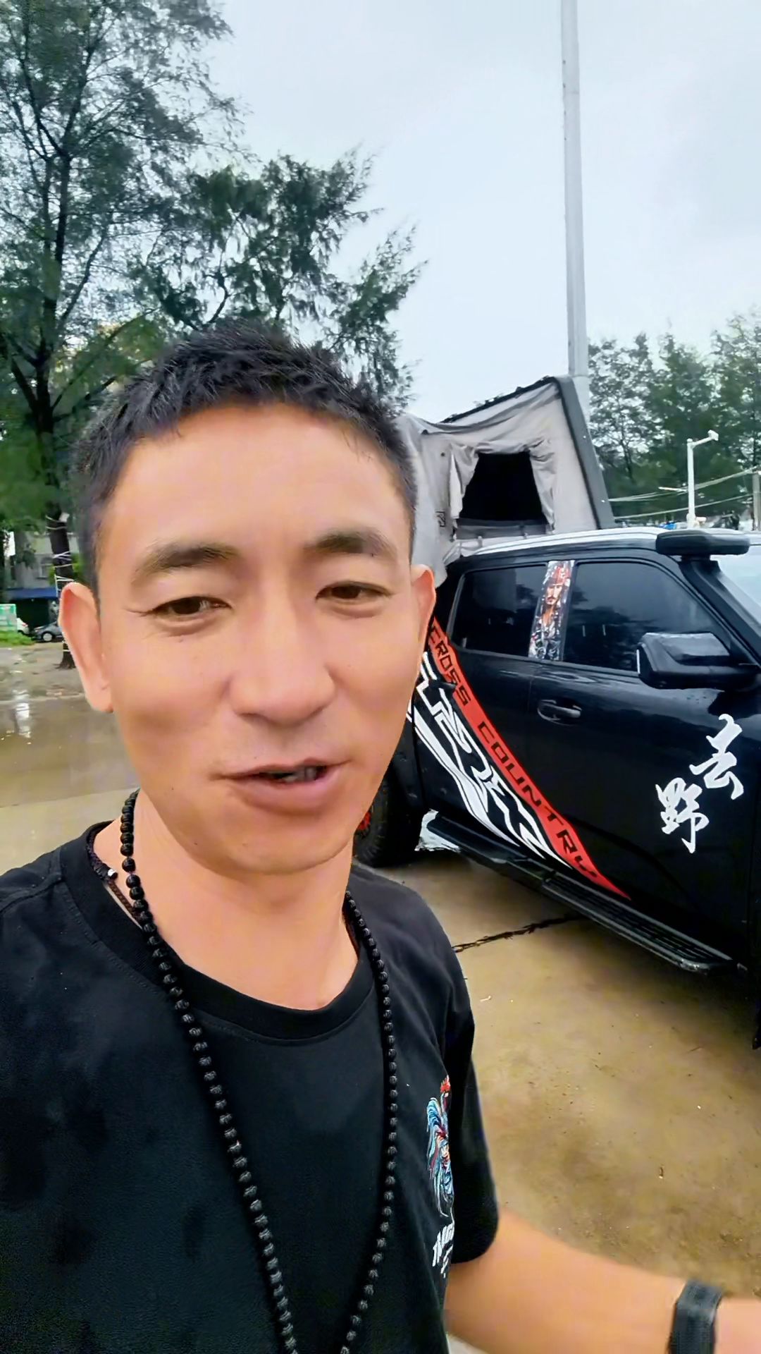 4. 这边找了个万滩,是这边东莞市的金滩,在这边露营结果昨天晚上下了一个晚上的暴雨,昨天晚上还是在海边喝了啤酒、吃的烧烤了,乐滋滋的,在那边的海鲜排档吃了一大桌的海鲜爽歪歪的。但昨天晚上睡觉的时候我就在车顶上装睡在海边,下了一个晚上暴雨,帐篷是防雨的没有关系,但是由于我在海边住的次数不多,半夜起来来看天气预报,我担心有台风,因为我那个车子特别的帐篷打开来了,受面有点广,一个晚上在担惊受怕,今天早上才起来。