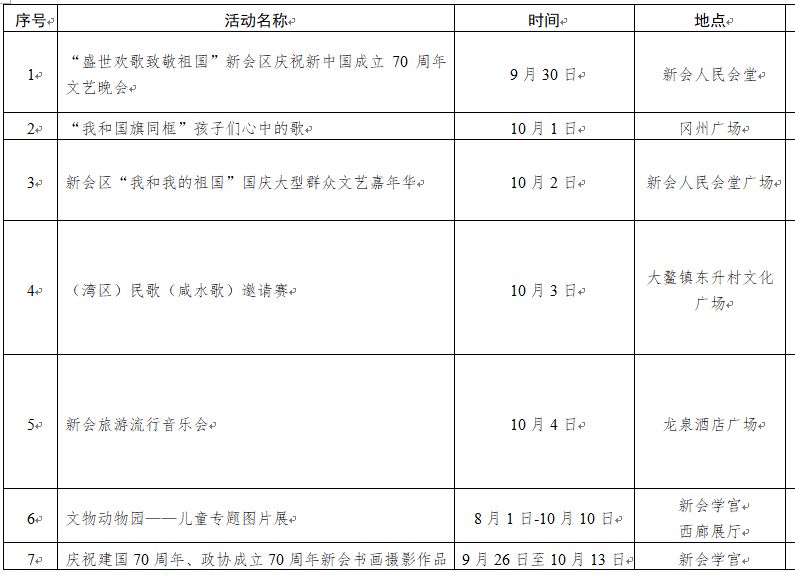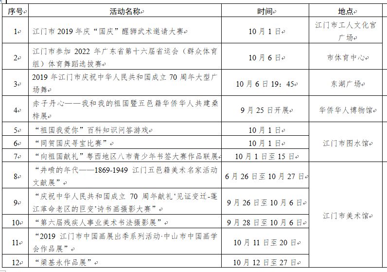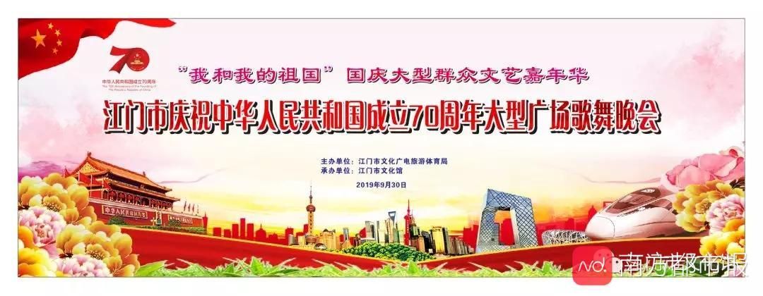 9月30日晚20时,由江门市文化广电旅游体育局举办,江门市文化馆承办,“我和我的祖国”国庆大型群众文艺嘉年华之江门市庆祝中华人民共和国成立70周年大型广场歌舞晚会将在五邑华侨广场舞台上演。
