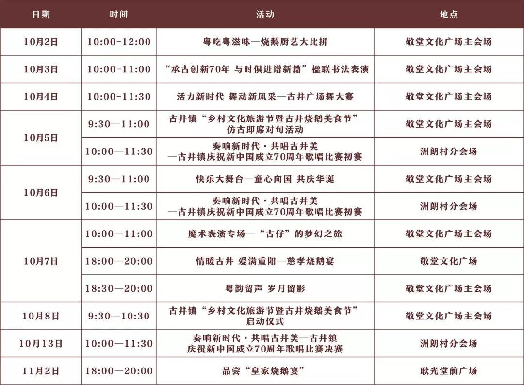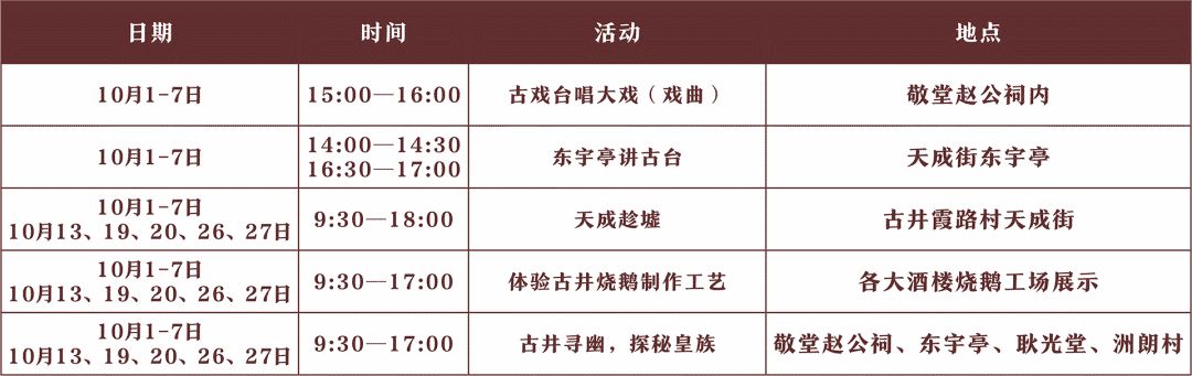 国庆期间,古井镇将举办乡村文化旅游节暨古井烧鹅美食节,届时,你可以到“天成街趁墟”,在仿古街市买特产、玩仿古游戏,体验古井烧鹅制作工艺、到古戏台听大戏,去东宇亭听讲古。