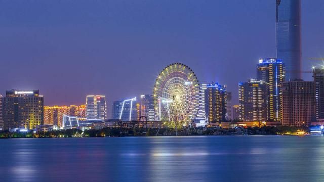 #唯美夜景的摩天轮#金鸡湖是从之前的苏州的著名渔场变成了一个城市湖泊公园。湖滨大道有亲水宜人的木质走廊,非常适合悠闲地散步。夜晚十分静谧,推荐去湖边乘坐摩天轮。
