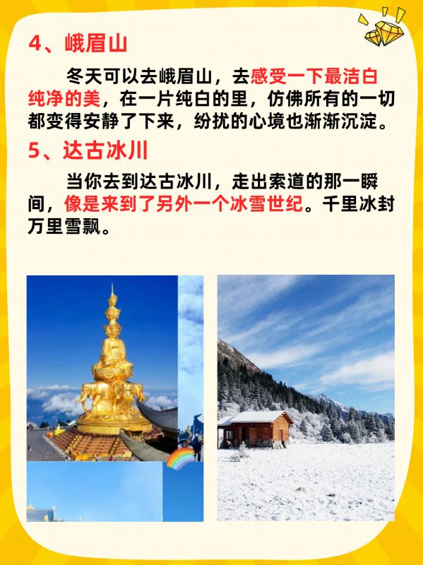 瓦屋山: 位于四川盆地东部的自然景区,拥有壮丽的雪山和森林景观。