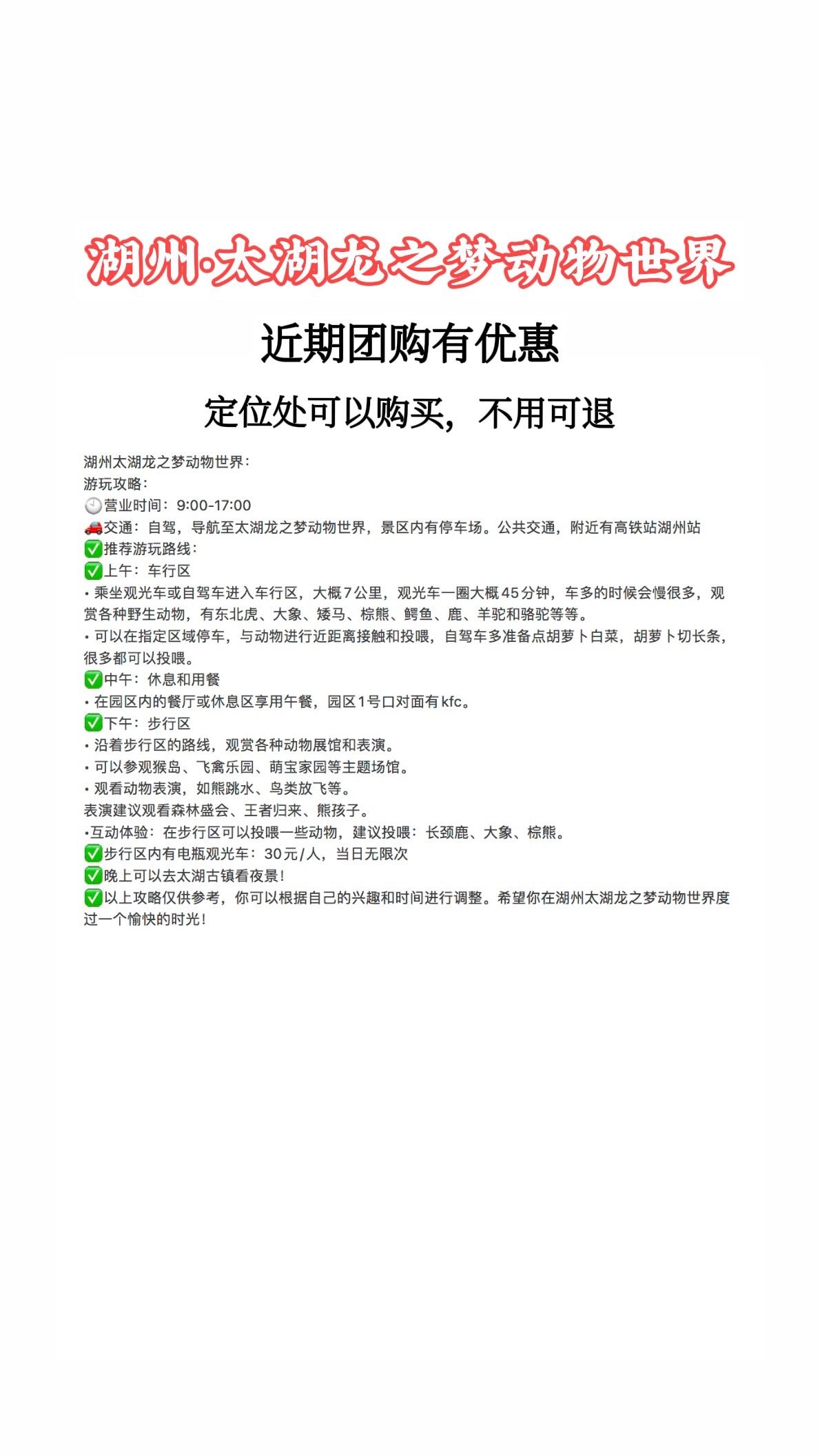 以上攻略仅供参考,你可以根据自己的兴趣和时间进行调整。希望你在湖州太湖龙之梦动物世界度过一个愉快的时光!
