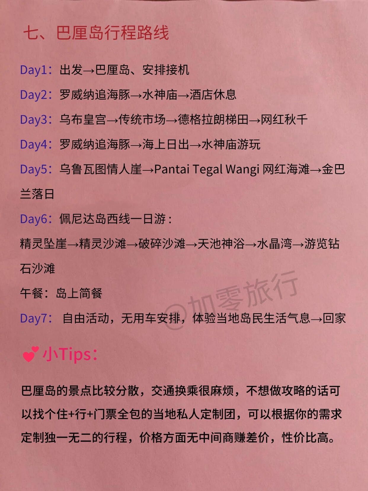 小Tips:巴厘岛的景点比较分散,交通换乘很麻烦,不想做攻略的话可以找个住+行+门票全包的靠谱当地私人定制团,像图片上面的行程可以根据您的需求来规划~