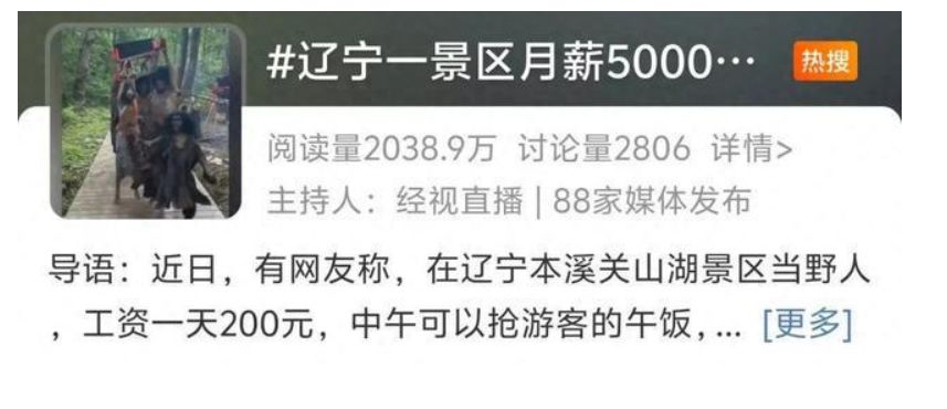 最近,辽宁本溪关山湖景区的“野人”岗位火了。谁能想到,每天扮成“野人”吓游客还能月赚5000元?消息一出,这个听起来怪诞的工作立马成了香饽饽,短短一周内,近百人争相报名