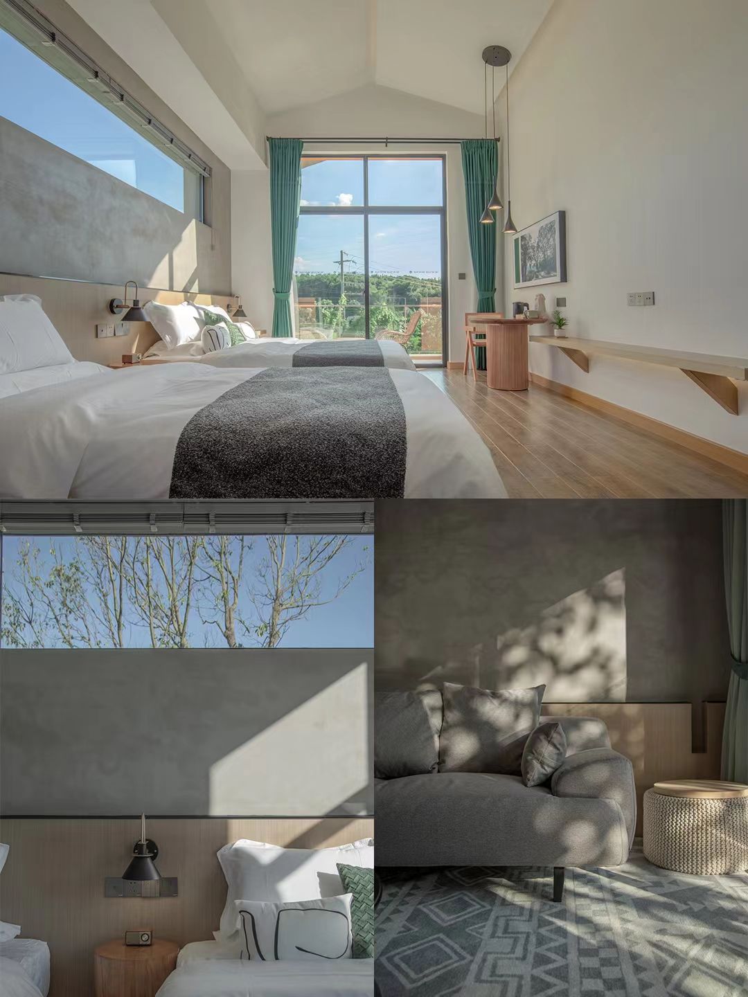 每个房间都有大面积的落地窗,让视线可以落到远处乡野中,疗愈身心如果家庭出游,也有山野套间或是独栋别墅可以选择,舒适又安逸
