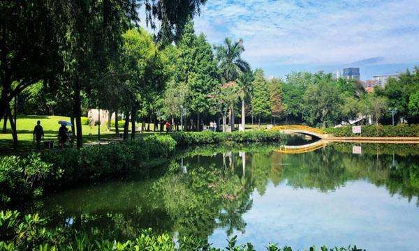 湖公园有员当渔火、坐石临流、员当春晓和曲水荷香四景。员当渔火原为厦门大八景之一,昔日港内万点渔火,像天上繁星,若隐若现,闪烁不定,构成员当渔火胜景。春有桃花、紫藤花,四季三角梅架下品茶,冬天赏成片黄色落羽杉~