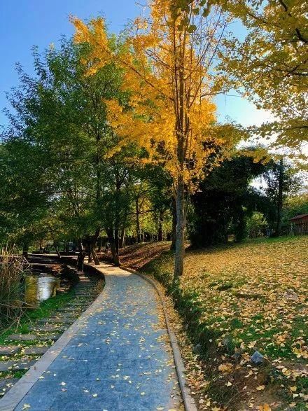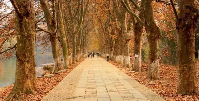 道路两侧是整齐繁密的法国梧桐,盛夏时,梧桐遮天蔽日,形成一条清凉的小路;秋冬时节则又成了一个金色长廊,金黄色的叶子掉落在地上,层层叠叠,踩上去,吱吱作响,使你的脚步也不由自主地变轻起来。