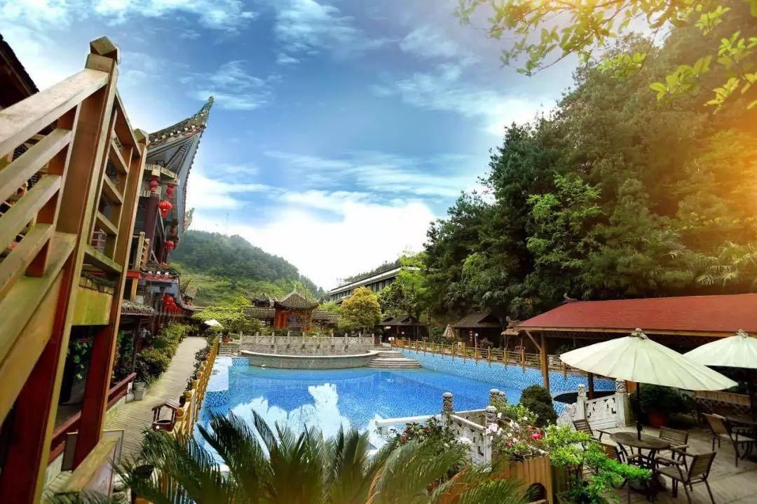 陪衬着风景秀丽,水碧如玉、清流蜿蜒的白马峪山谷,彰显幽静宁雅。整个温泉以园林式古建筑布局为主题,点缀生态花卉配合峡谷风光,良好的自然风貌,群山环抱,鸟语花香,区内亭台楼榭错落有致,以“中国风”风格独树一帜。
