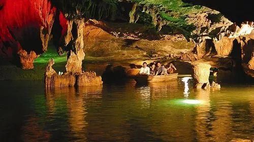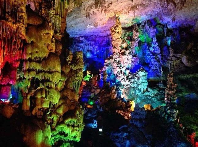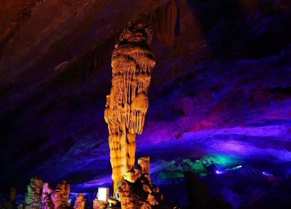石笋、石瀑、石幔、石帷幕,琳琅满目,灿如仙境。整个洞穴纵深1公里,有三个洞厅,洞内造型各异的石笋和钟乳石在各色灯光映衬下特别漂亮。
